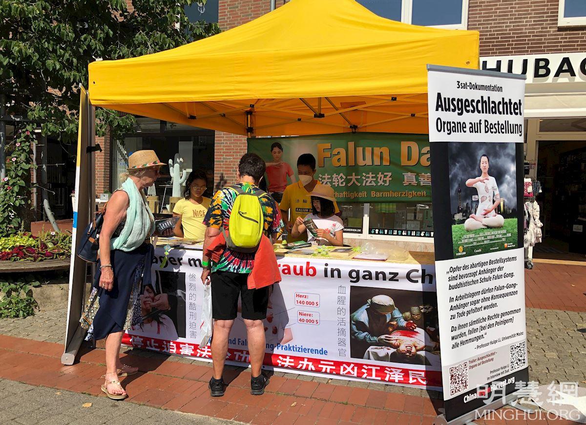 索尔陶(Soltau)位于北部汉诺威和汉堡之间,是一座只有两万人口的城市。七月二十四日,法轮功学员来到市中心步行街集市大街(Marktstraße)举办信息日活动。当天时逢集日,很多人都看到法轮功学员的活动。