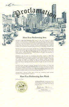 休士顿市长褒奖神韵艺术团,宣布二零二一年九月十九日至九月二十六日为:“德州休士顿神韵艺术团周”,休士顿市长对这次成功的、令人难忘的活动表示最美好的祝愿。