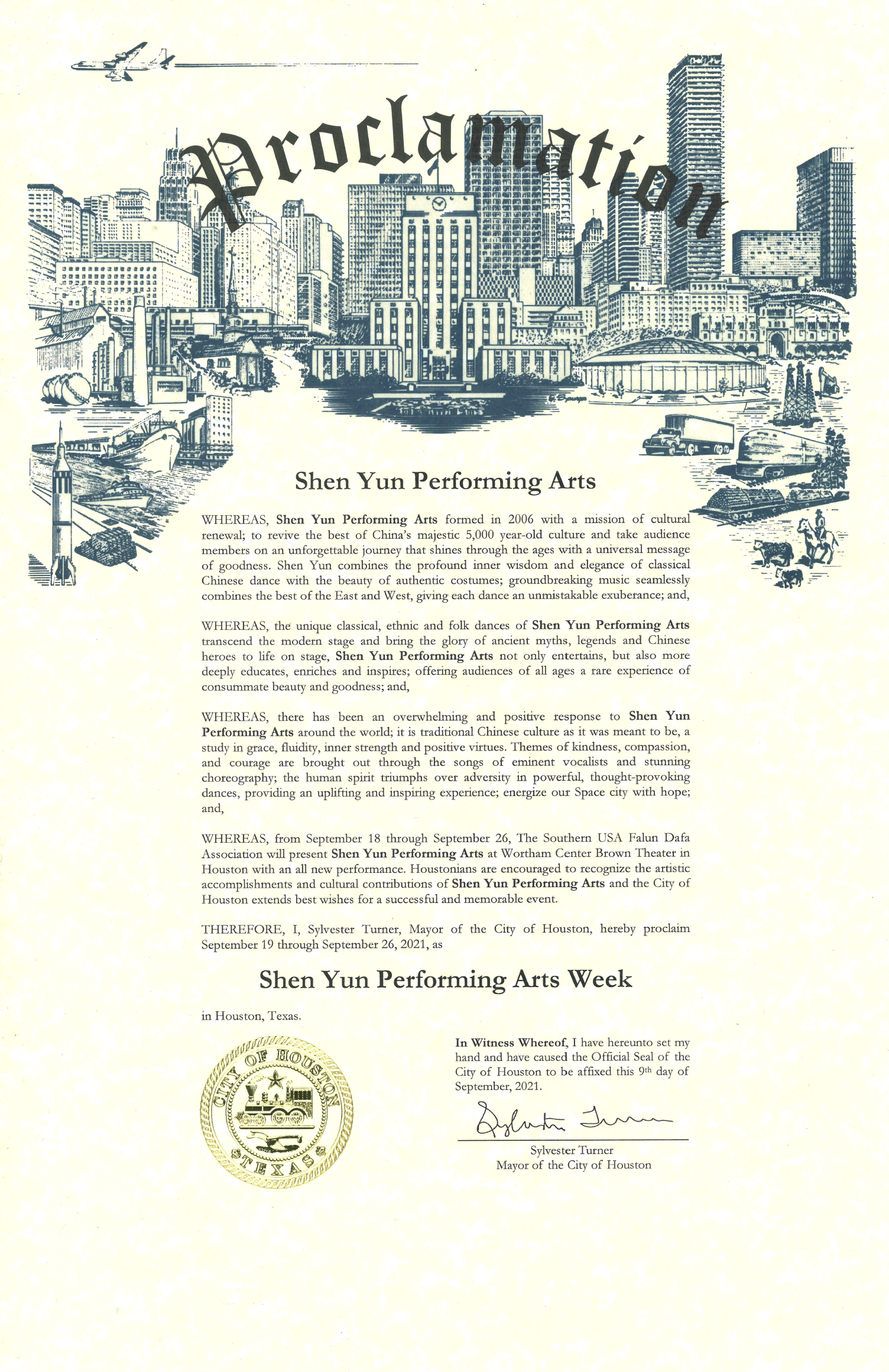 鉴于,二零二一年九月十八日至九月二十六日,美国南部法轮大法学会将在休士顿沃瑟姆中心的布朗剧院(Brown Theater at Wortham Center)举办神韵表演艺术,这是一场全新的演出。休士顿人很高兴认识到神韵艺术团的艺术成就和文化贡献,休士顿市对这次成功的、令人难忘的活动表示最美好的祝愿。