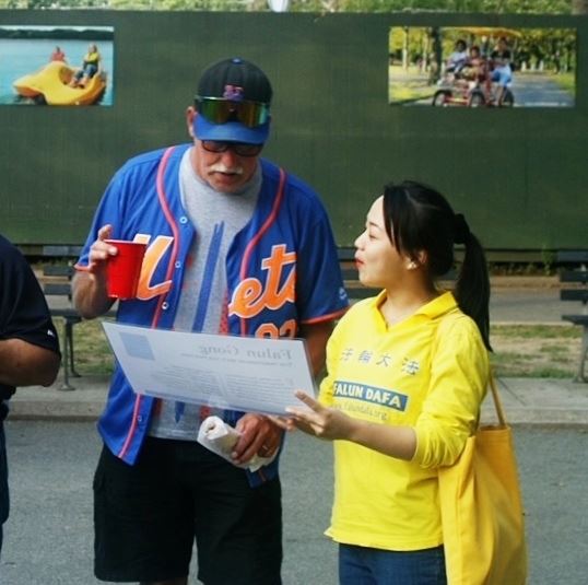 由于是一年一度国际网球大满贯比赛的决赛,法拉盛草原公园内的游客大增,许多人在法轮功真相展板前驻足,了解到反迫害真相,有的人当场学炼功法,有的人表示支持法轮功学员反迫害。