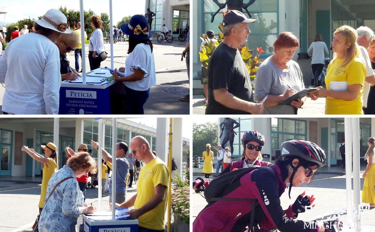 真相台设立在皮耶什佳尼温泉岛的柱廊桥边,上面摆放了资料和征签表。伴随着祥和优美的炼功音乐,几位学员展示舒缓柔和的法轮功功法。还有学员向过往的游客派发着关于法轮功反迫害的真相传单,揭露中共对修炼真、善、忍的法轮功学员长达二十二年的迫害,以及中共活摘法轮功学员等良心犯器官牟利的罪恶。