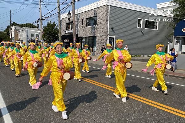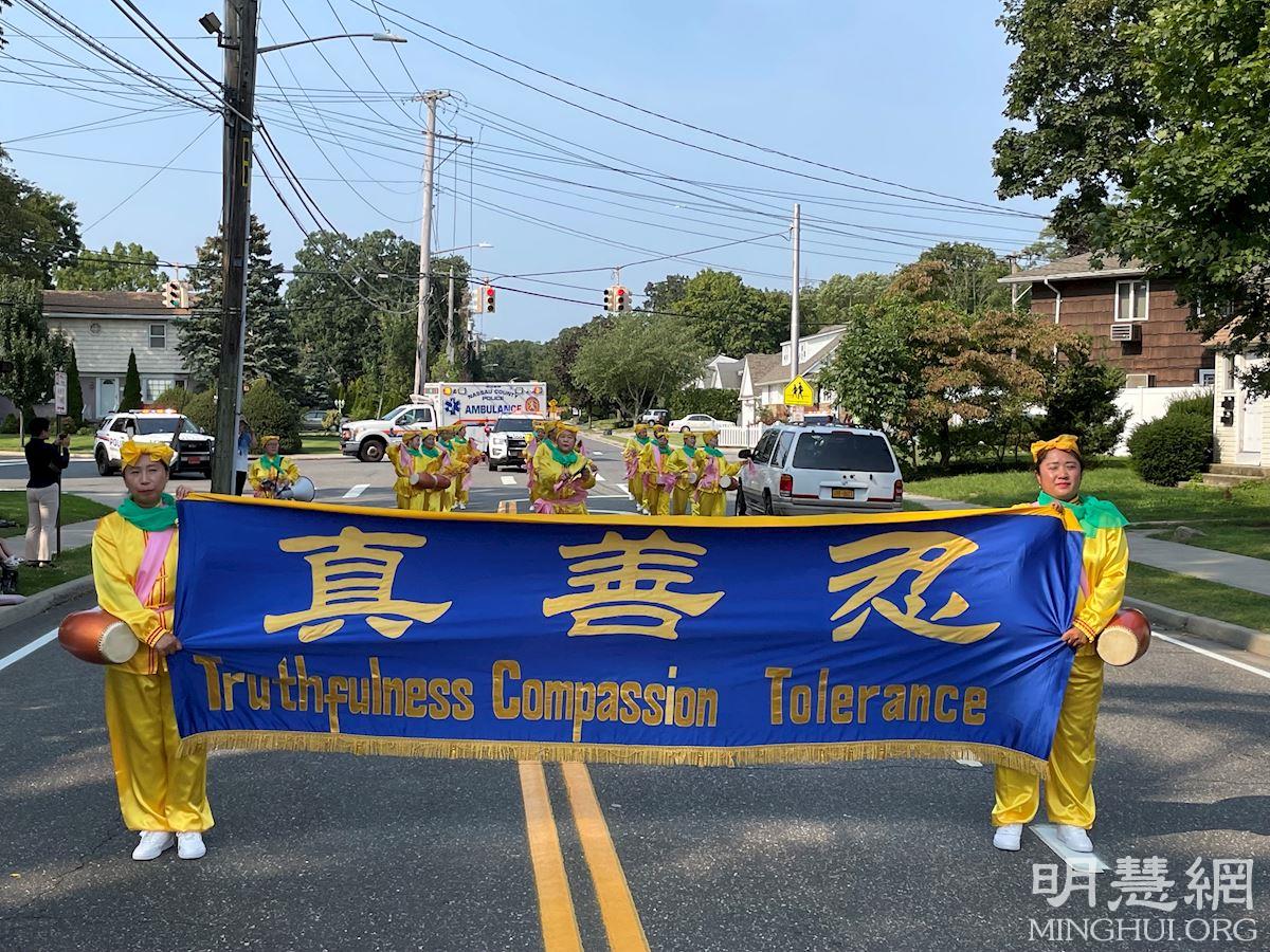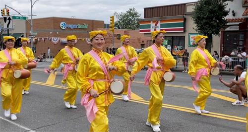 ![]() 图4~5:法轮功腰鼓队参加长岛法明代尔村(Farmingdale Village)的游行,带去喜庆。 |