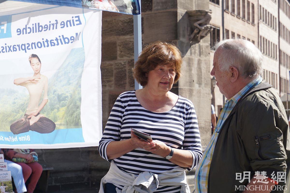 信息日活动在位于市中心的洛伦兹教堂前举办,这里是纽伦堡最繁华的地段,过往人流络绎不绝。行人中不仅有购物休闲的当地居民,还有许多前来观览洛伦兹教堂的游客。法轮大法悠扬悦耳的炼功音乐和舒缓、祥和的炼功动作,吸引了很多行人驻足。