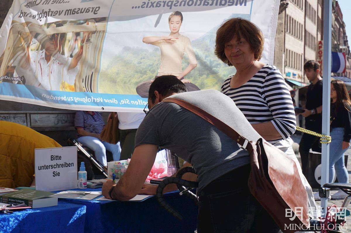 在柏林一家大学任职的德国数学家克里斯森(Christian)看到法轮功展位后驻足,对学员说:“我知道法轮功。在柏林的中国大使馆前经常能看到你们,我认为你们人都非常好,非常正。中共对法轮功的迫害邪恶的令人发指。”他告诉学员,他读过两个来自加拿大的大卫组织的独立调查团报告;但不知道自己能做些什么。当学员告诉他,涓涓细流终成大海,当更多的人能站出来对中共说不的时候,正义的力量会令邪恶胆寒,中共会垮台,他点头同意,在征签表上郑重地签下了自己的名字。他说:“是的,我要让我的声音汇入这洪流,我希望德国的政治家们能听到来自民间的声音,这残酷的迫害必须立刻被制止。我希望所有的西方国家都能站出来,捍卫正义、道德和人权,对中共说不!”
