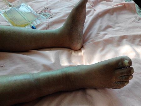 ![]() 图2~3:出狱时下肢皮肤都是坏死的,呈黑色的 |