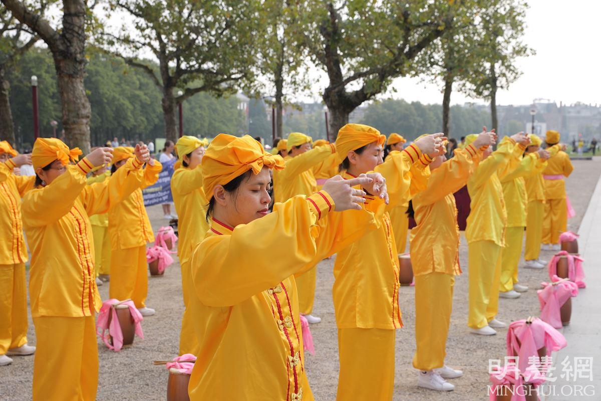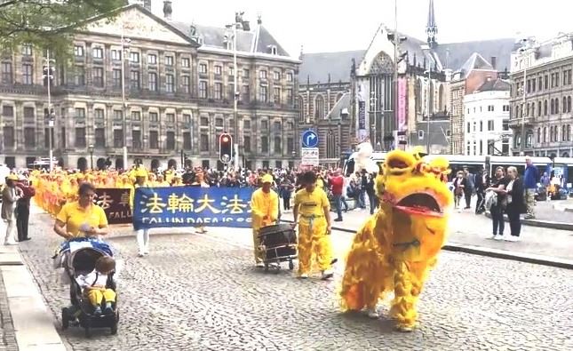 集会之后,法轮功学员还在水坝广场展示了功法,缓慢舒展、简单易学的动作,悦耳动听的音乐,让现场民众感受到祥和美妙的能量场。欧洲天国乐团的演奏神圣庄严;来自荷兰、德国等国的腰鼓队,身着金色服装,扎着粉色腰带,挎着棕色腰鼓,敲着欢快的鼓点;来自波兰和德国的舞龙舞狮表演充满活力,展现了法轮功修炼者的风采,吸引了大量民众的目光。