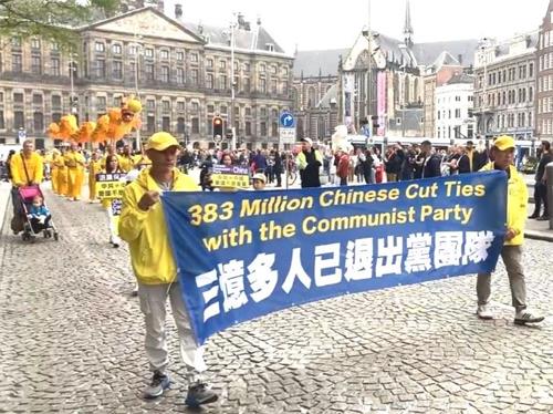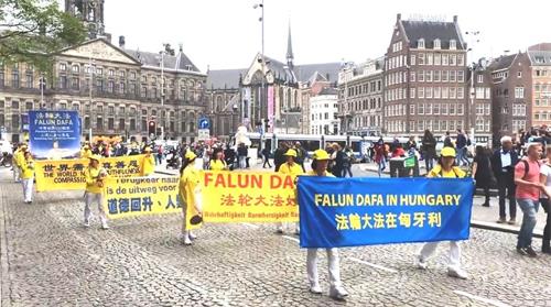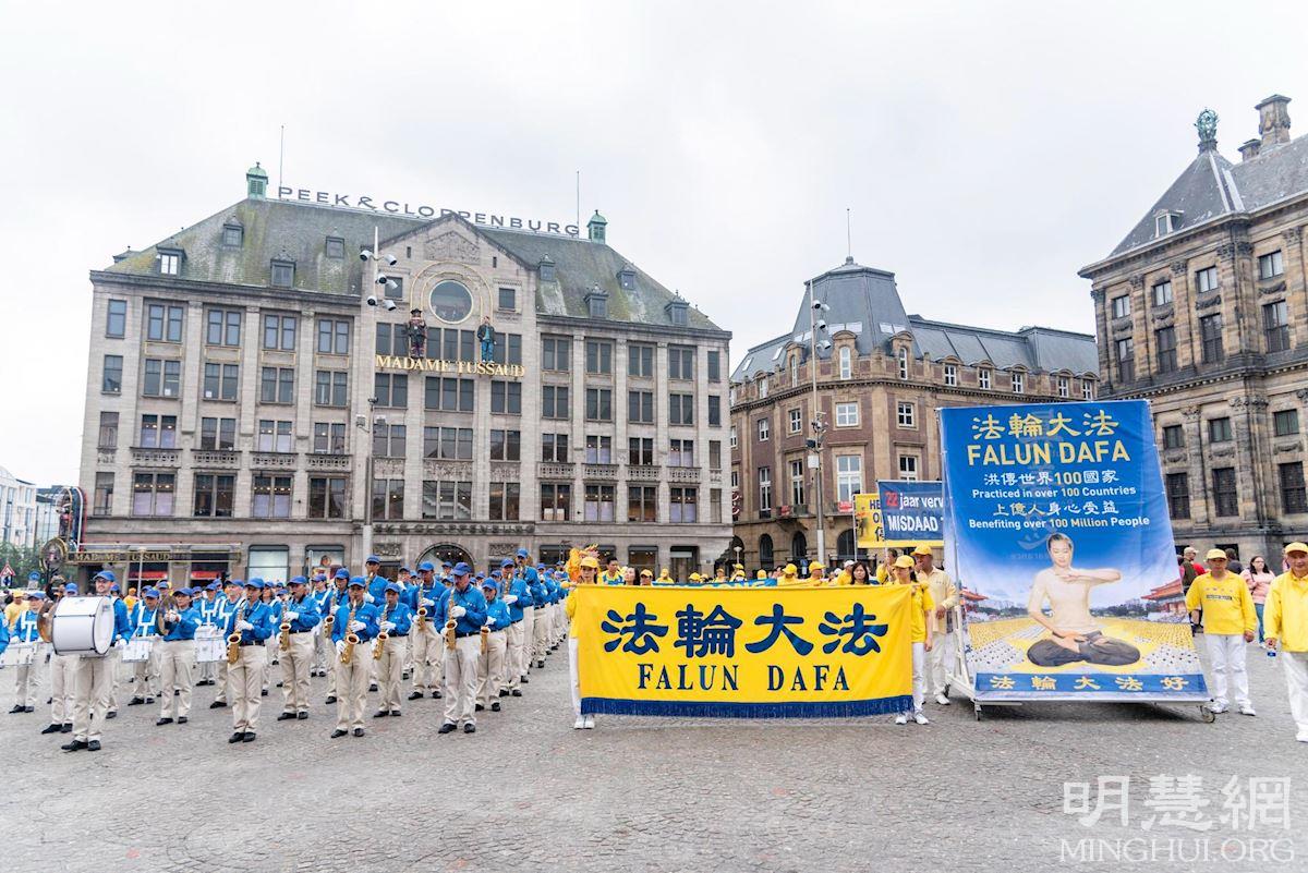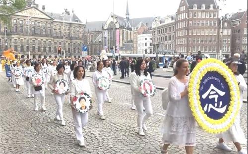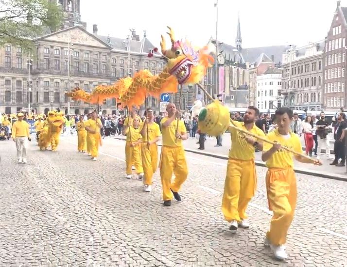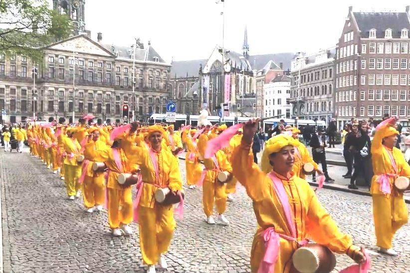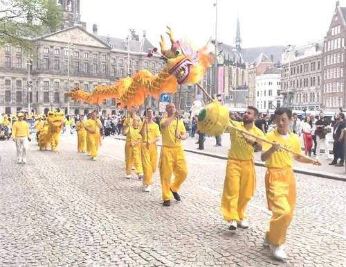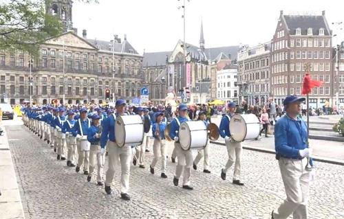 水坝广场的集会结束后,开始了盛大的游行。游行队伍从达姆广场穿过附近商业区及唐人街。欧洲天国乐团走在最前列,其成员来自欧洲不同国家,十多年来,他们的足迹遍及欧洲十几个国家。当天,他们演奏了“法轮大法好”、“法鼓法号震十方”、“欢乐颂”、“神圣的歌”等乐曲,嘹亮的音乐,震撼心灵,腰鼓队队员们表演了“法轮大法好”、“三:退.保平安”、等曲目,带给疫情中的人们希望和生机。