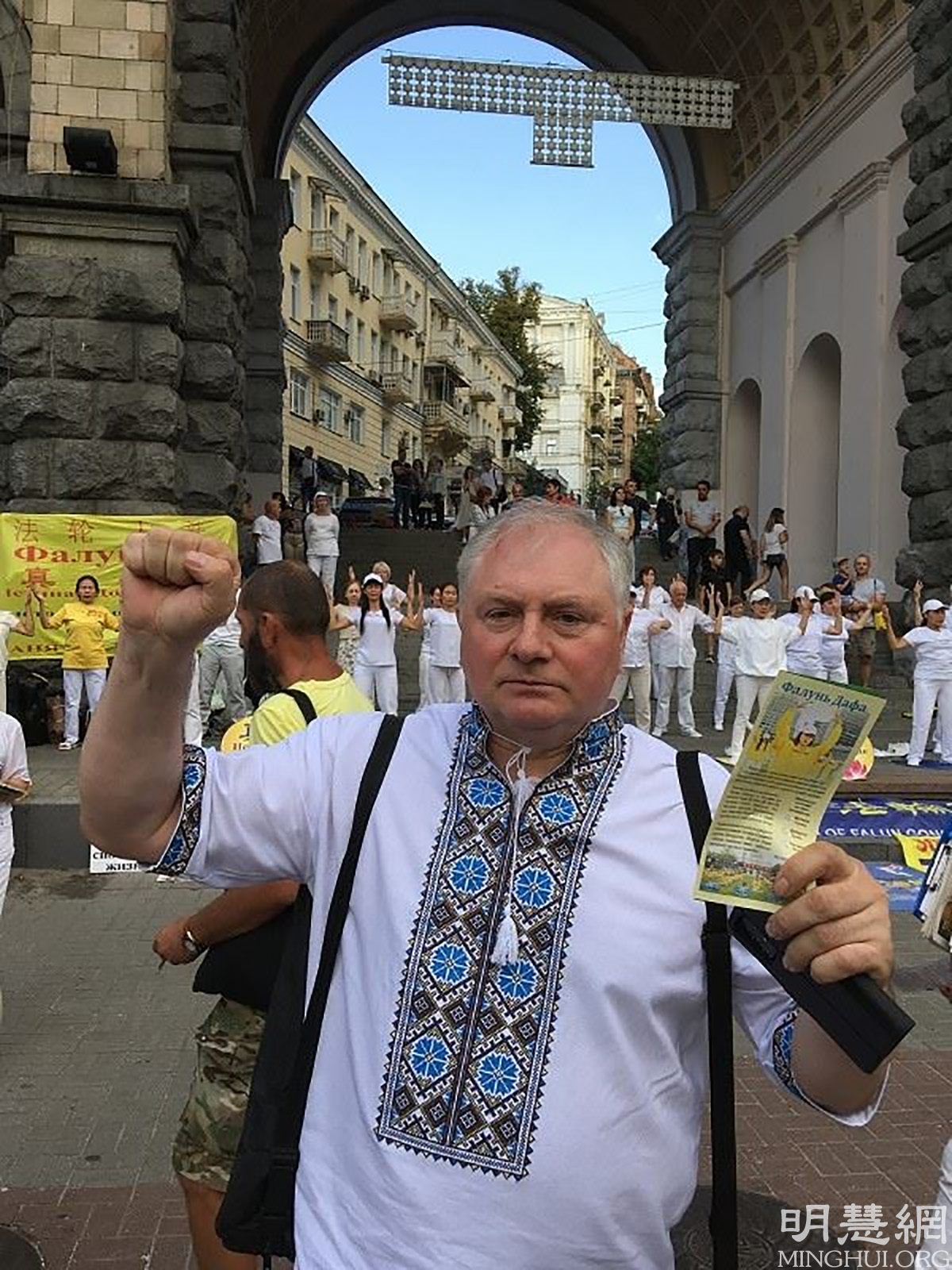 游客尼古拉(Nickolai)来自加拿大多伦多,他到基辅庆祝乌克兰独立日。当他看到法轮功学员举行的活动,分享了他的想法。他说:“我支持(反迫害)这一活动和抗议者的诉求。因为我住在多伦多,在加拿大我看到了同样的(反迫害)活动,并签署了一份请愿书,要求中共停止对这些人(法轮功学员)的酷刑迫害。实际上,这是共产主义犯罪体系的运作。那些与中国进行贸易赚钱的人会想:‘我宁愿经济上的增长,管什么人权呢。’但是,如果你忽视人权,其它一切都是虚假的,因为共产主义或早或晚会以不同的形式出现。因此,人们几乎忘记了中国是共产主义极权制,它在欺辱人民。经济增长和其它的一切都是建立在沙滩上。如果存在强制的因素,虐待他人和迫害的因素,不管它(共产主义)有多可怕,多丑恶,都必会以某种方式影响这个体制。我们知道苏联体制很畸形,现在已经不存在了。我认为,共产主义政权也会如此。中国终将会摆脱它(共产主义)。”