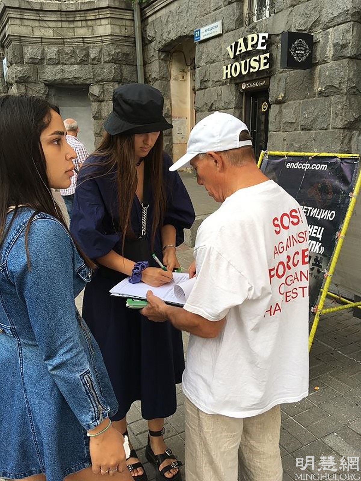 卡嘉(Katya)和帕吉娜(Patina)来自乌克兰海滨城敖德萨。她们表示很喜欢法轮功功法。法轮功学员集体展示功法动作时,她们尝试着向学员一起学炼。帕吉娜说她真的很喜欢法轮功功法,想要更多的了解法轮大法。她们明白真相后,签名声援法轮功学员反迫害。