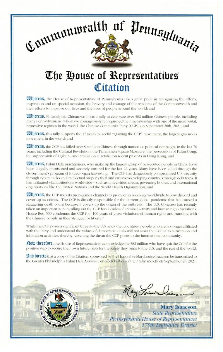 宾州众议院为此次集会发来了嘉奖令,赞扬退出中共及其附属组织的三亿八千万民众“为确保他们的未来迈出了积极的一步,也给美国和世界其它地区带来了安全”。嘉奖令是由宾州州众议员玛丽・艾萨克森(Mary Isaacson)起草的。