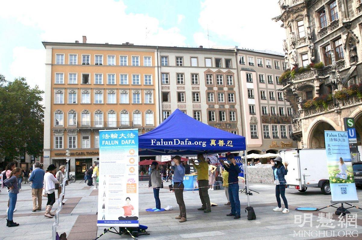 ![]() 图1:二零二一年九月一日,法轮功学员在德国慕尼黑玛琳广场(Marienplatz)举办真相日活动,图为法轮功学员展示功法。 |