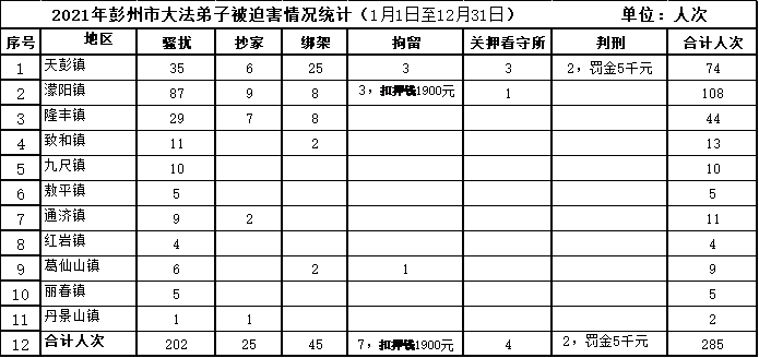 据明慧网消息报导的不完全统计,二零二一年一月一日至十二月三十一日,彭州市法轮功学员有285人次遭受迫害,迫害严重的地区有天彭镇、蒙阳镇、隆丰镇,很多学员被多次骚扰迫害,害得家属担惊受怕,居无宁日。