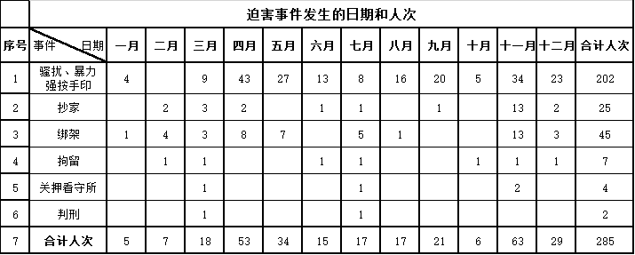 彭州市法轮功学员中,被骚扰和强按手印的202人次,非法抄家的25人次,绑架45人,非法拘留的7人,非法判刑的2人,非法关押看守所的4人,共计285人次。另有17人未计入统计总数,分别是绑架到彭州市“关爱中心”(原市“六一零”办公室)进行迫害的16人,绑架到四川新津洗脑班迫害的1人。情况统计如下表: