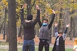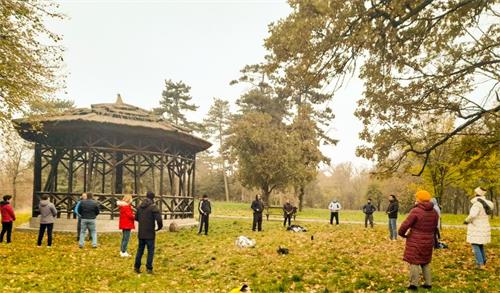 ![]() 图1~2:法轮功学员在罗曼内斯库公园炼功 |