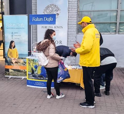 法轮功学员给了一位女士真相资料,并告诉她,法轮功是基于真、善、忍原则的性命双修功法。但是中共使用暴力,强迫人们放弃自己的信仰。这位女士表示,她是个有信仰的人,很高兴自己有机会了解了中共迫害的真相。