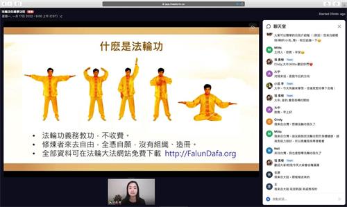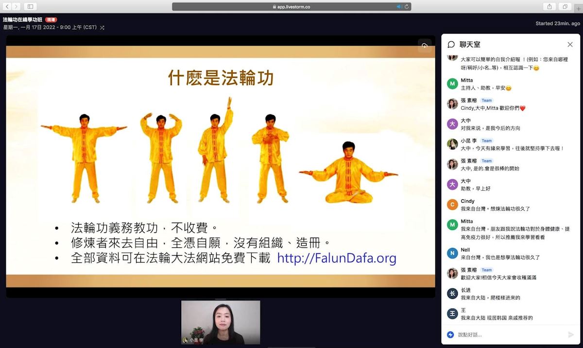 ![]() 图2~3:中文网上学功班,主持人在介绍法轮功。 |