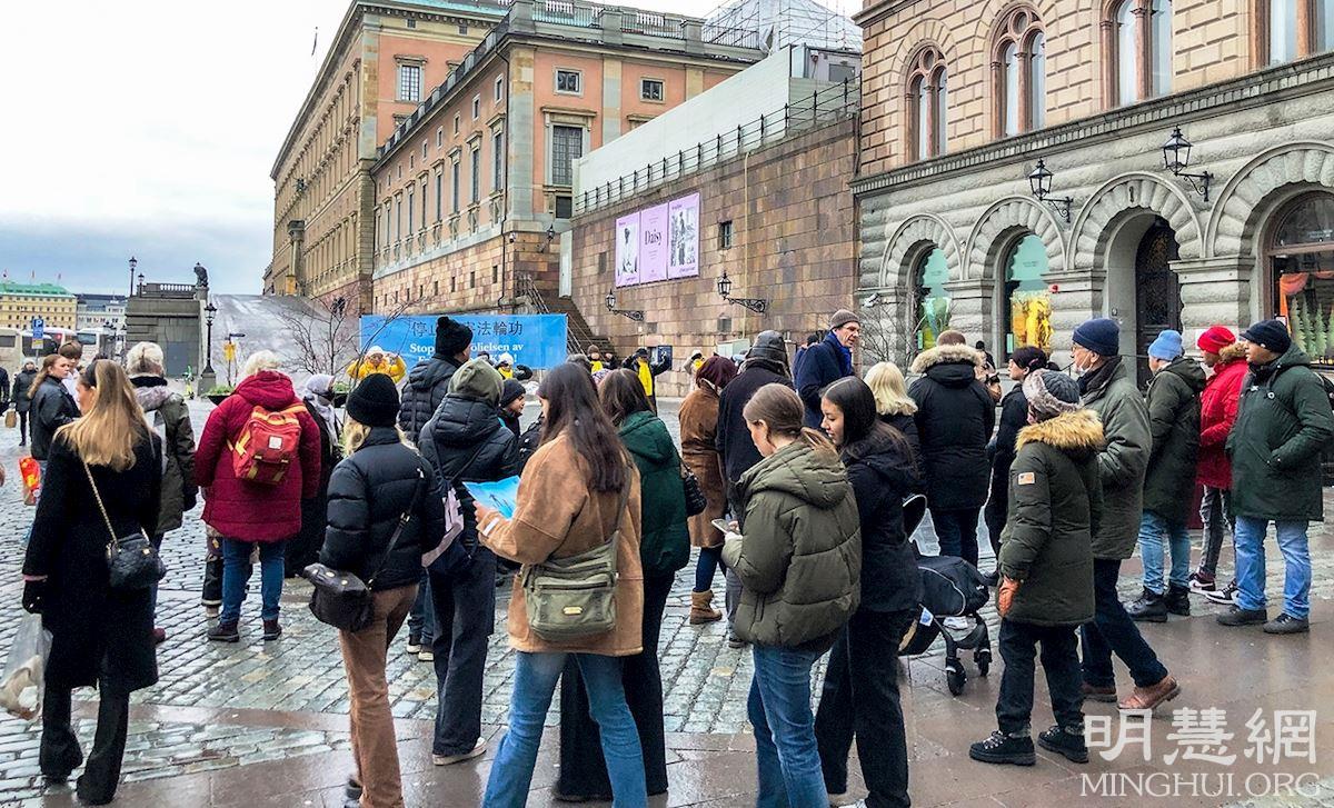 ![]() 图1:二零二一年的十二月份,在斯德哥尔摩市中心国会大厦旁的钱币广场,每逢周末两天,法轮功学员都会举办讲真相活动。 |
