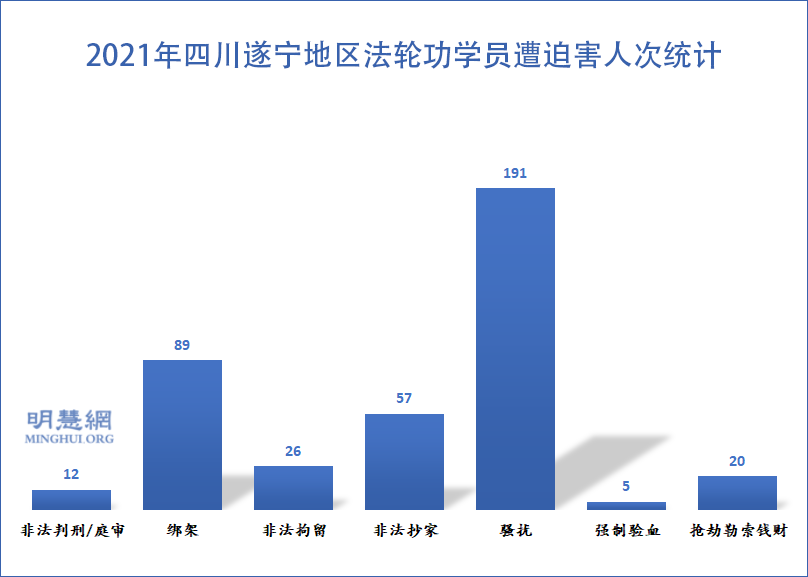 据明慧网信息不完全统计,在二零二一年的“清零”骚扰中,遂宁地区至少有9名法轮功学员被非法判刑,三人被非法庭审,三人被取保候审;被绑架89人次;被拘留26人次,一人送洗脑班;至少57人被抄家;至少191人次被骚扰;20人被抢劫和勒索钱财;五人被强制验血。