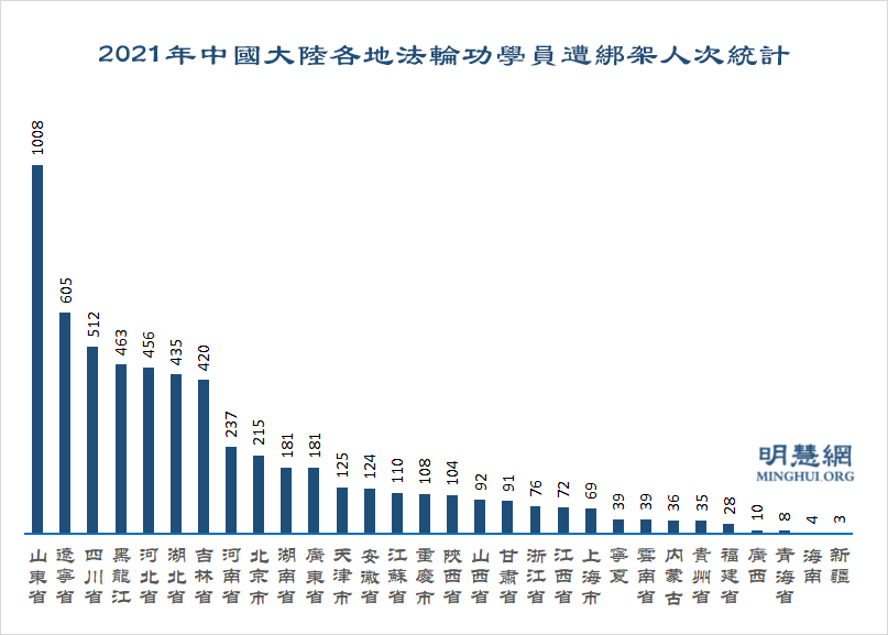 ![]() 图3:2021年中国大陆各地法轮功学员遭绑架人次统计 |