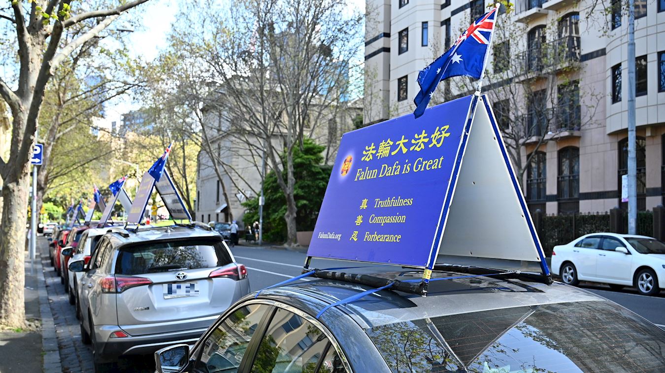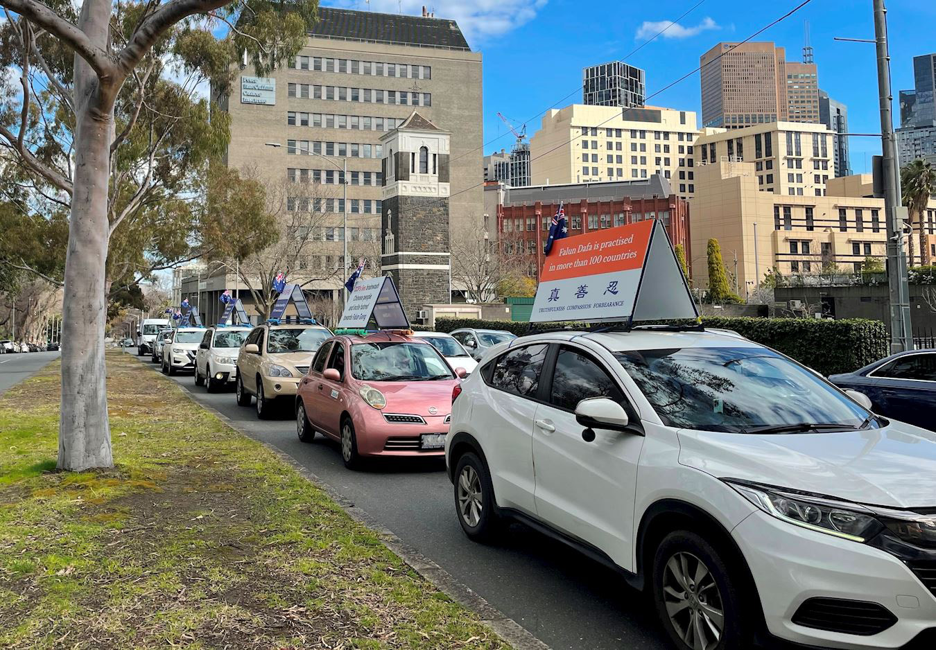 法轮功学员在二十多辆汽车顶部的展板上,安装了中英文双语的“法轮大法好,真善忍好”、“法轮大法洪传全球,亿万人受益”、“法轮大法免费教功”、“中国大陆法轮大法修炼者冒死讲述真相”等真相讯息。