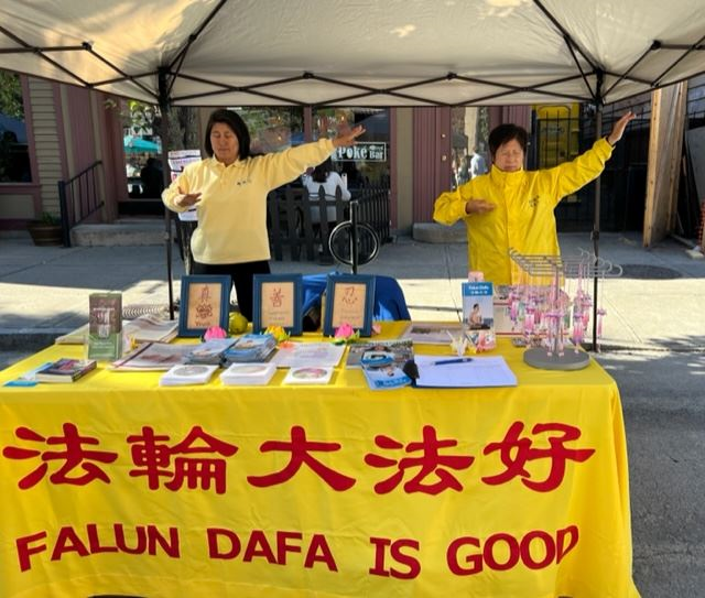 有位中年女士走过法轮大法的展台,被小莲花吸引,走近展位,问学员这是什么,怎么这么好看。学员跟她讲了大法的美好和祛病健身的功效。中年女士说她不久前被诊断为癌症第四期,心里一直很沉重,但是听了学员介绍的大法的美好后,她的眼睛亮起来了,人也精神起来了。她跟同行的朋友说,回去一定上网了解法轮功。她临走前给了学员一个大大的拥抱,感到了得救的希望。