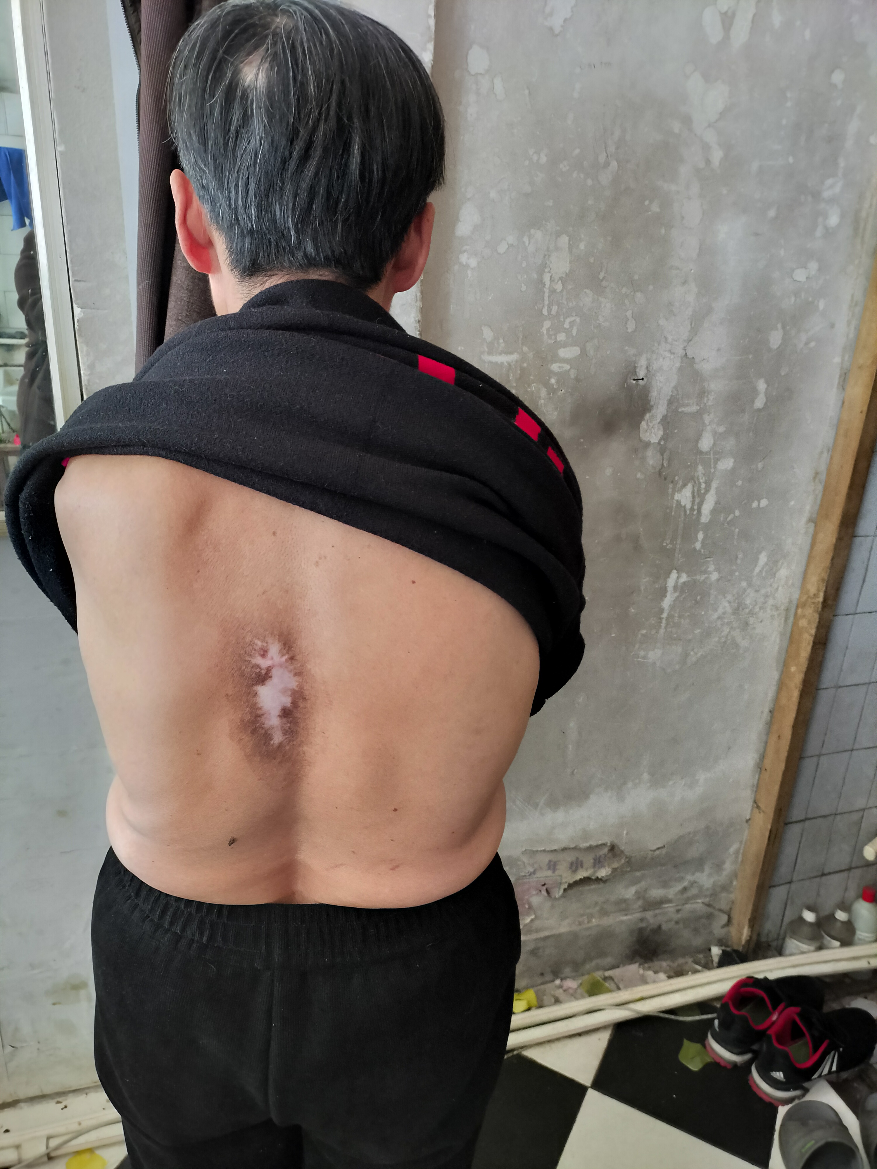 第三天晚上,在404监号,犯人看完中央新闻以后,屋里犯人都被哄出去了。犯人生产组长肖淼拿着装上开水的塑料雪碧瓶,随后宋兰杰、娄爽和李某,把电视柜挪到一边,她们把装上开水的塑料雪碧瓶放到我的后背上烫,她们拽着我的两只手和两个衣角不让我动,一直到开水不太热了才松手。我的后背被烫出了大泡,流出了脓水。烫后的第三天,牛静静队长带我到监狱医院上药,后来,又感染化脓了,烫伤持续了三个多月才渐好。为了掩盖罪恶怕别人看见,狱警让包夹犯人带我单独洗漱。我后背被烫伤的痕迹至今清晰可见。
