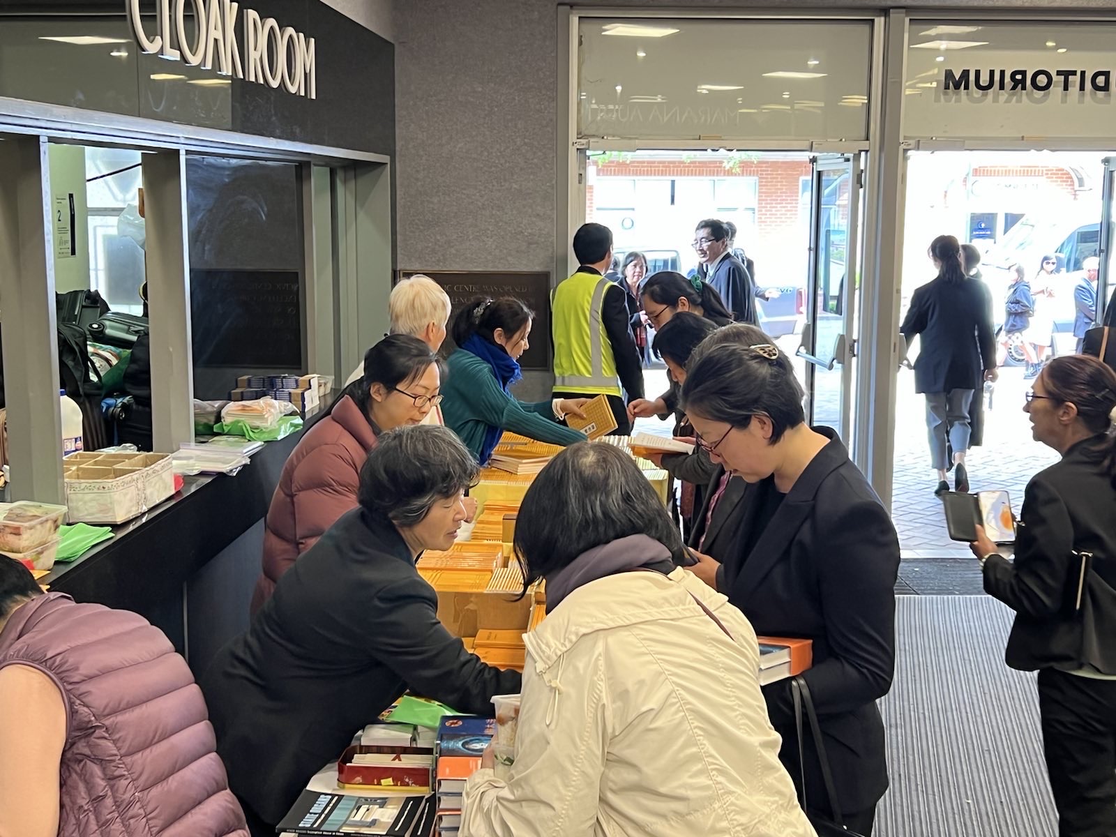 在法会中午休息和法会结束后,很多学员在法会现场的天梯书店购买到自己需要的大法书籍、纪念品等。天梯书店负责人表示,当天销量最多的是各语种的《转法轮》和《法轮功》。