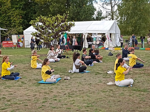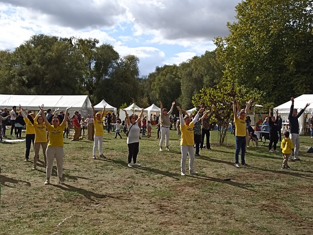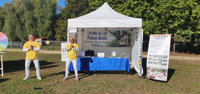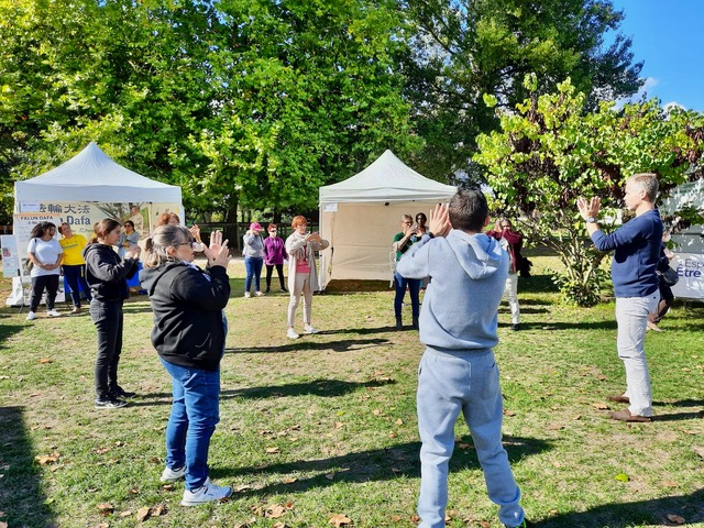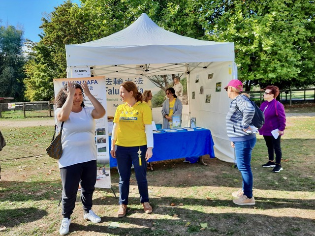 法轮功学员花了一整天的时间回答人们的问题,在展位上即时示范动作,并在会场中央举行功法展示,给感兴趣的人做简介。许多想要学习法轮大法的人留下了联系方式,等待参加当地学员举办的教功。