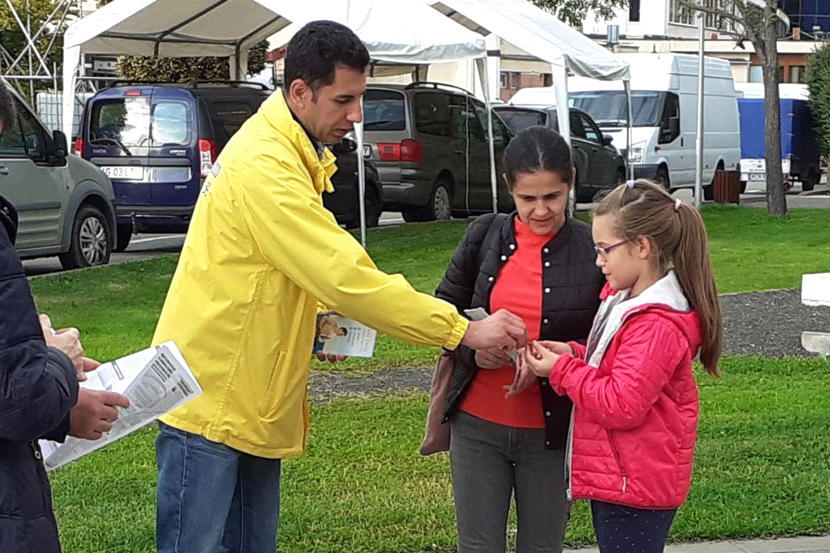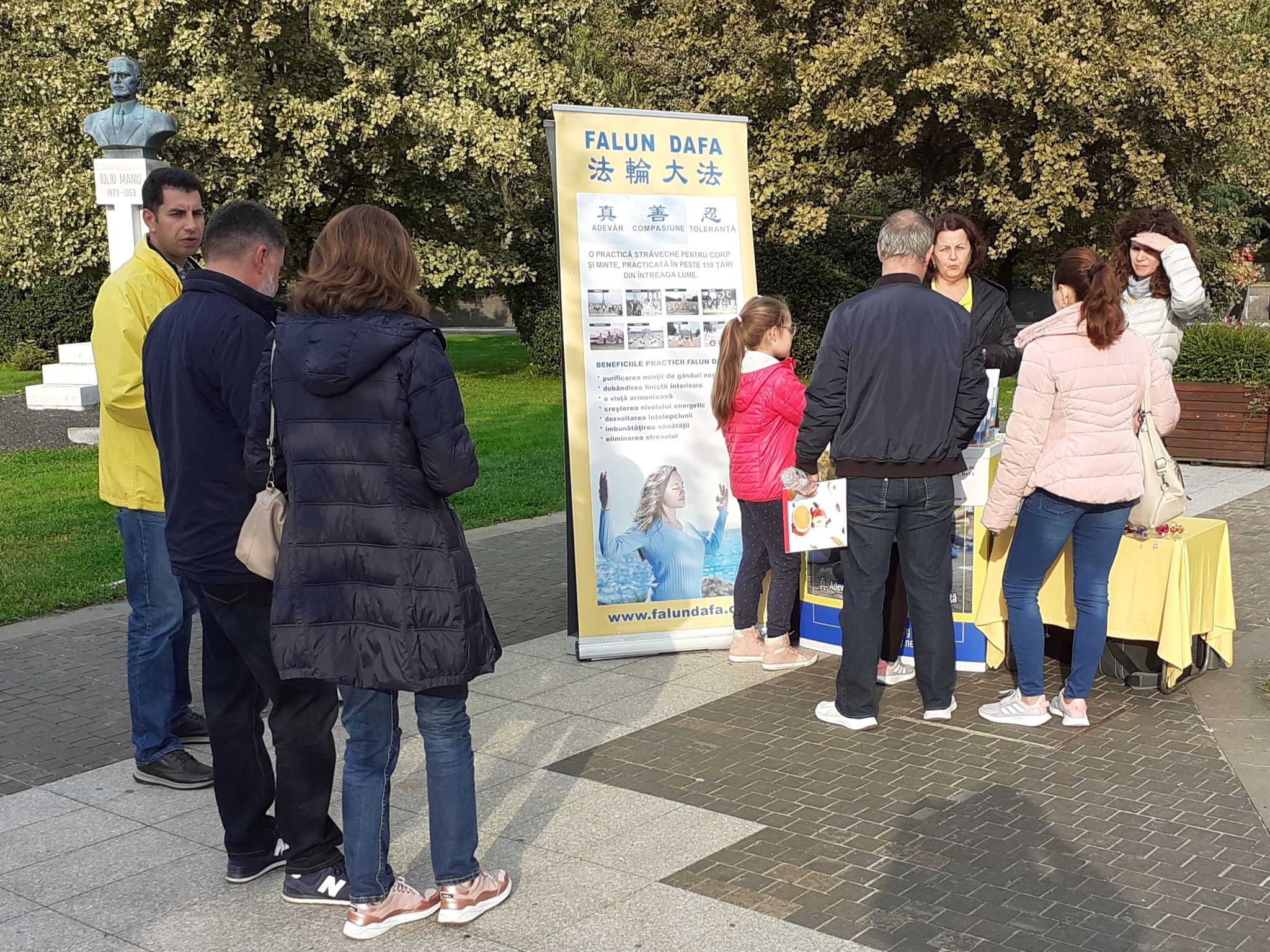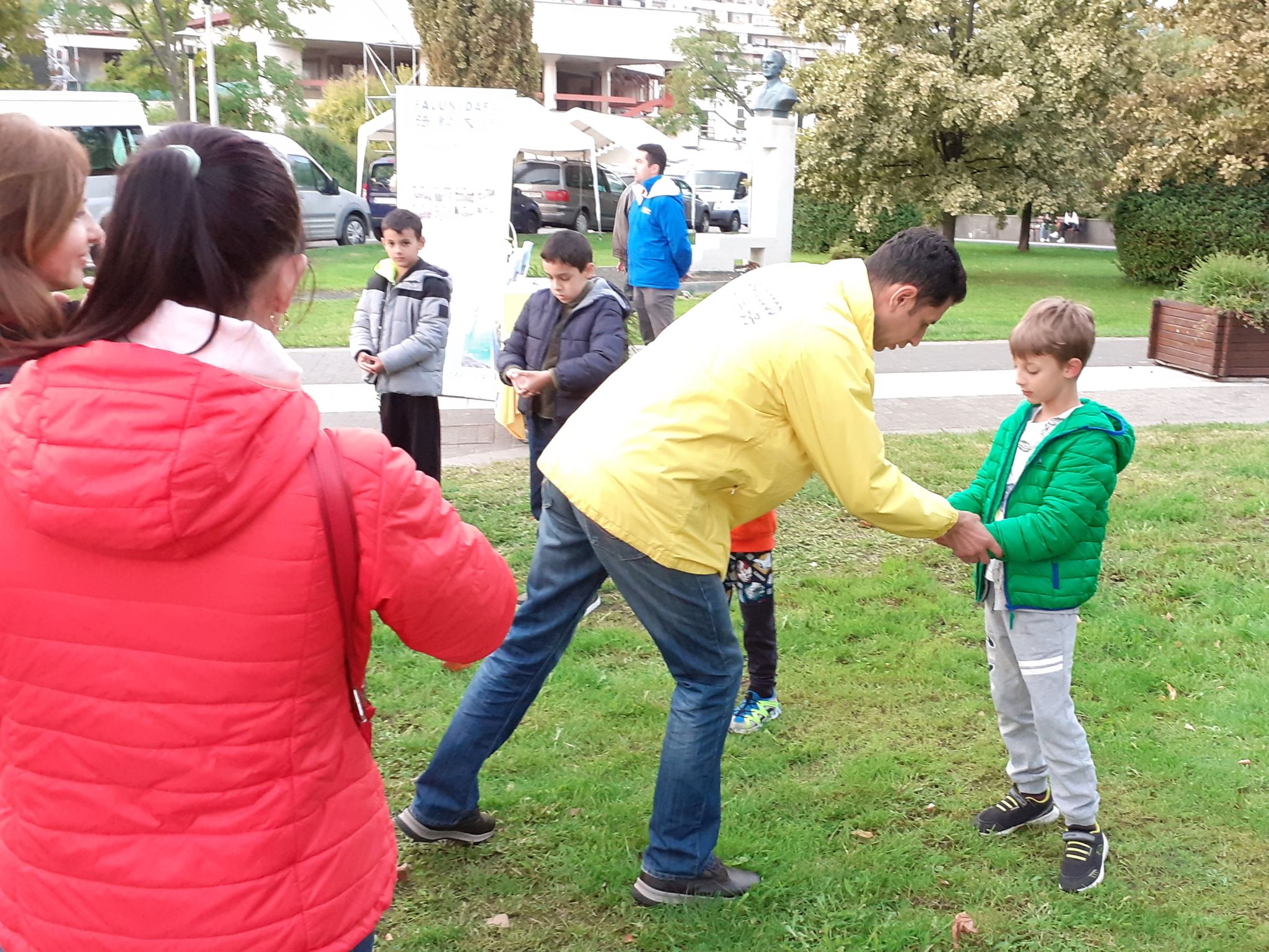 九月二十三日,法轮功学员设立了展位,并在展位前炼功,示范功法。人们被法轮功学员祥和的炼功场面所吸引,停下脚步观看,并索要真相资料。