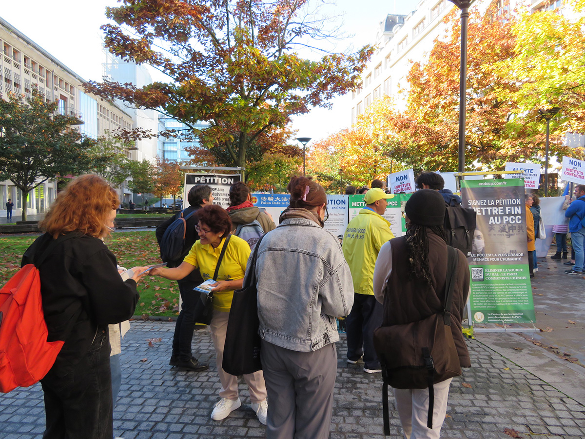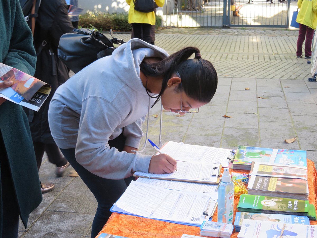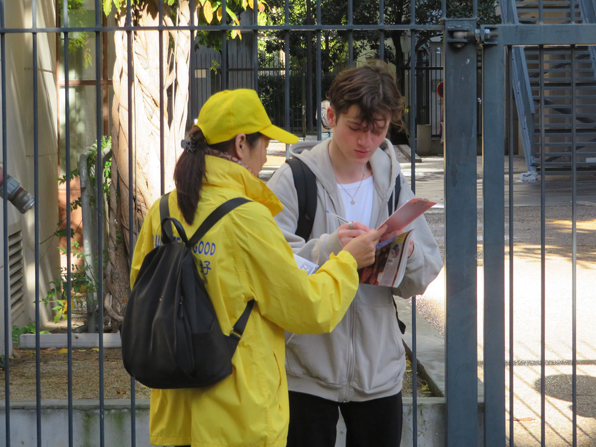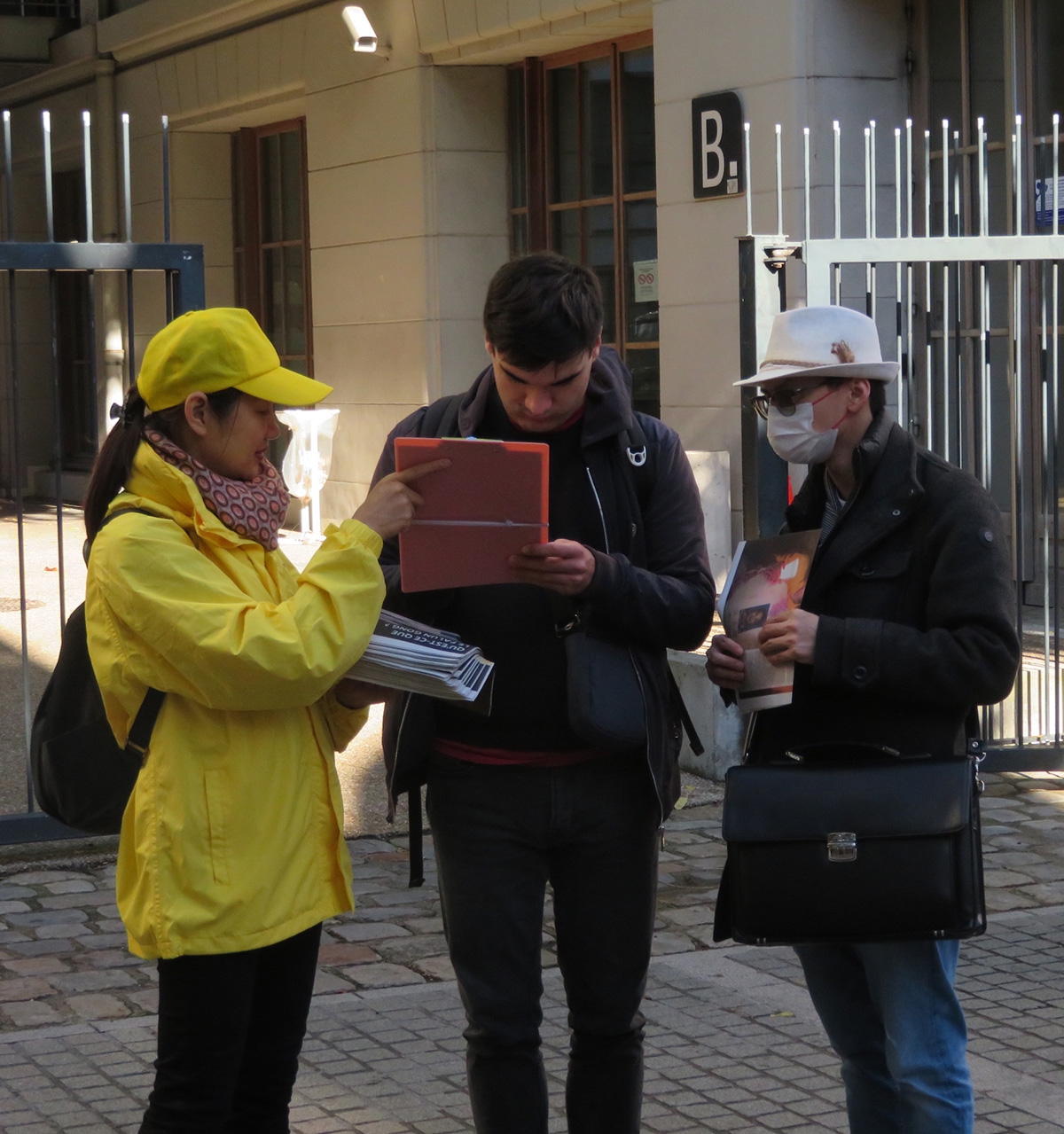 午间,很多学生看到了法轮功真相展板,得到了介绍法轮功的传单,他们都爽快地在反迫害征签表上签名,希望早日结束迫害。