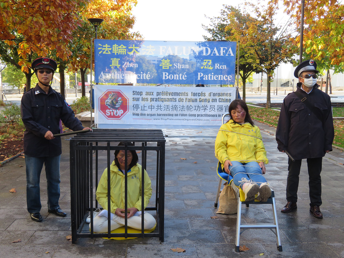 ![]() 图2:法轮功学员的模拟酷刑真人展示,揭露中共对法轮功的迫害罪行。 |