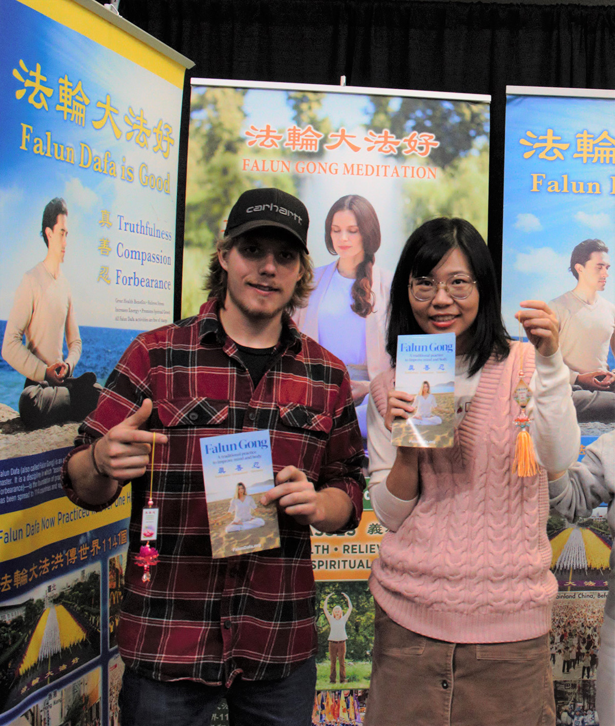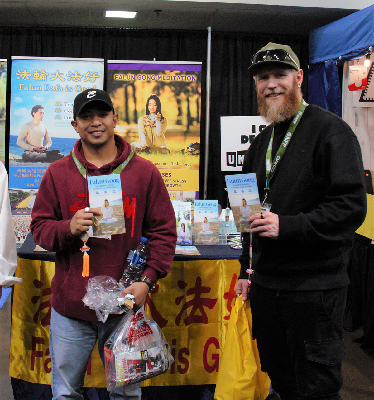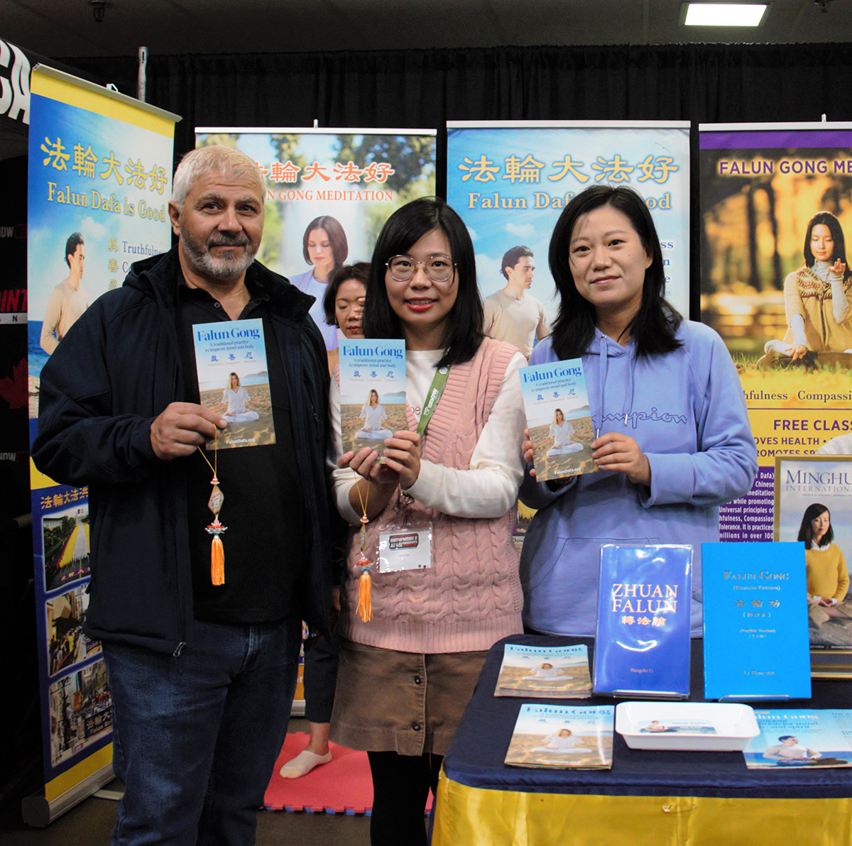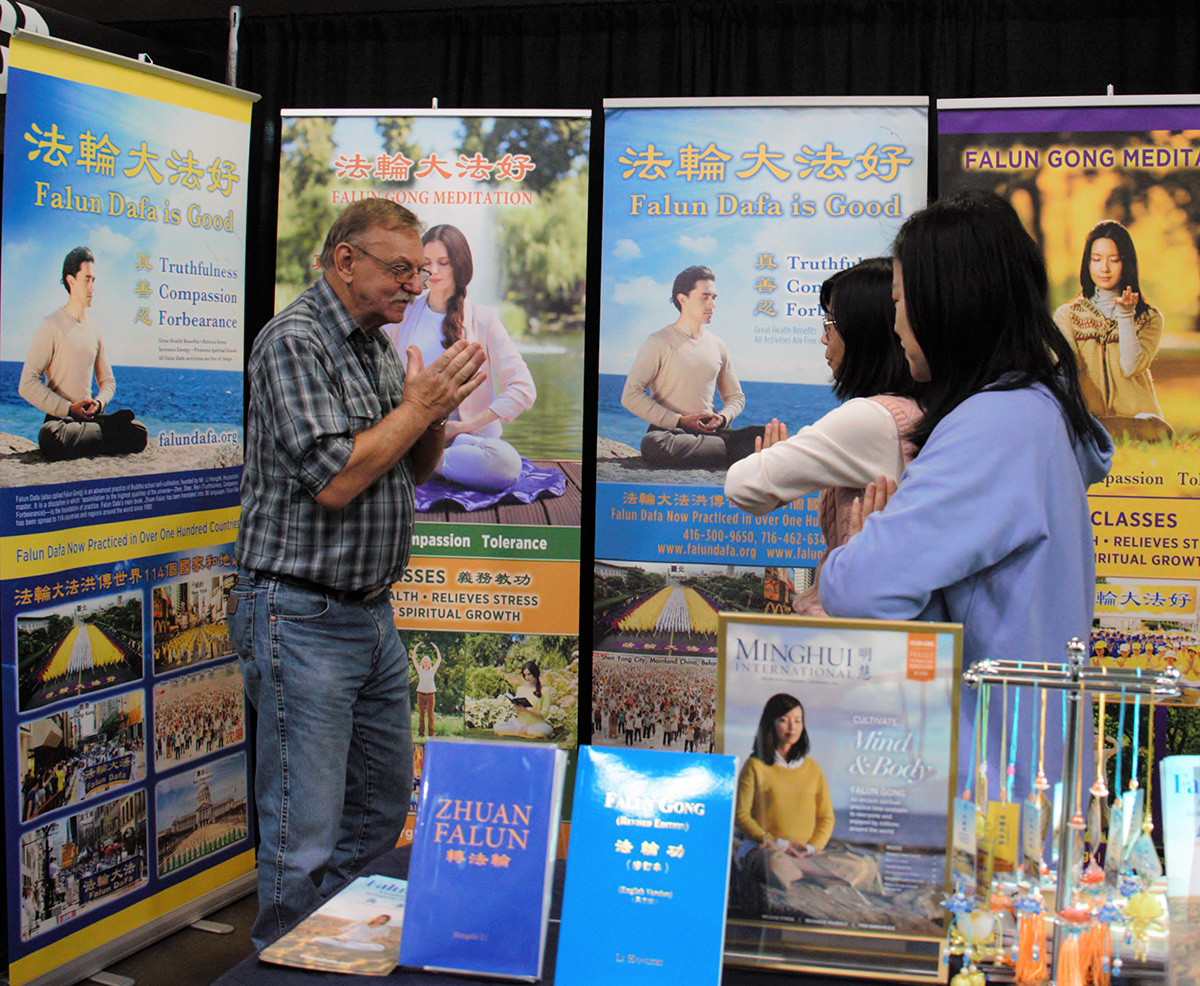 比尔(Bill)被在展位上炼功的学员吸引,来到展位前观看,听完学员的介绍就跟着两位学员在展位上学了第一套功法,他按着学员的教授,听着炼功音乐体验了第一套功法。