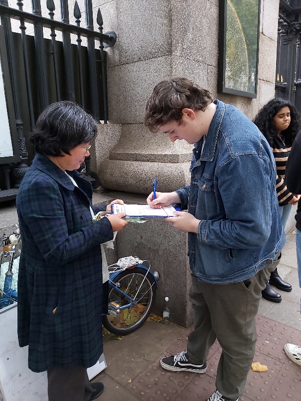 一位BBC的女记者拉丽莎(Larissa)经过时,匆匆拿了真相材料,签完反迫害征签表后,就进入大英博物馆。约莫半个多小时后,她再次出现在展板前,手握紧刚刚拿的真相材料表示在读完真相材料后,想与相关负责人联系,她希望能藉由媒体的力量为这些被迫害的人发声。