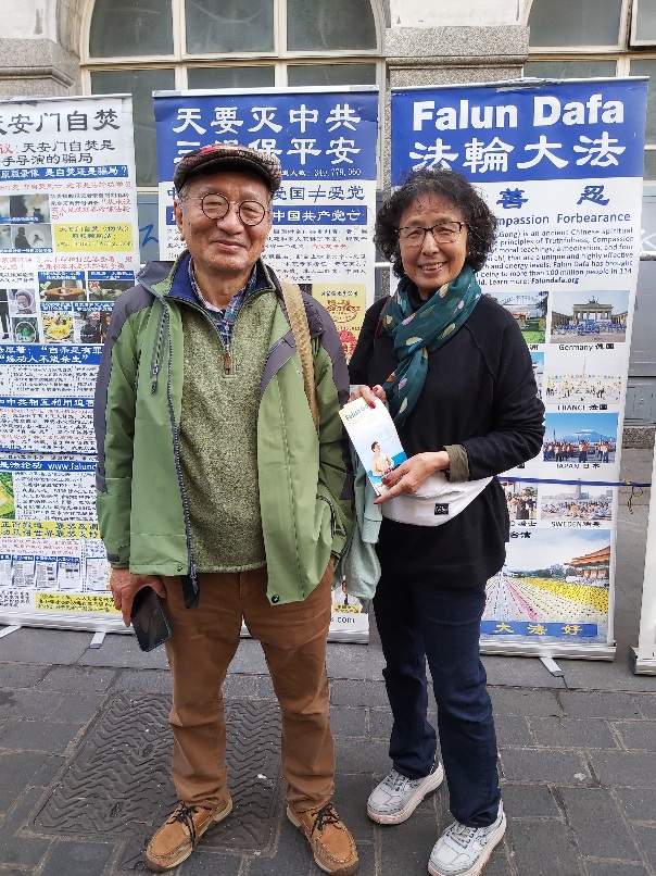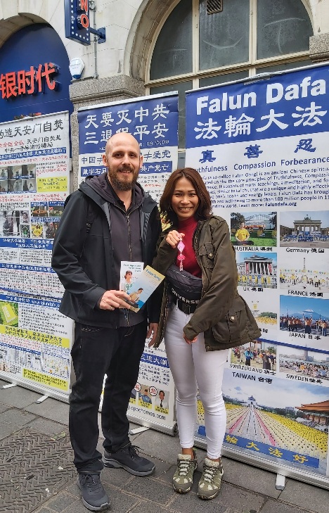 另一对住在曼谷二十多年的夫妻,先生克里斯(Chris)是英国人从事房地产,太太玫(May)是泰国人,在银行工作,他们在曼谷的唐人街曾看过法轮功,所以主动过来签名支持反迫害。