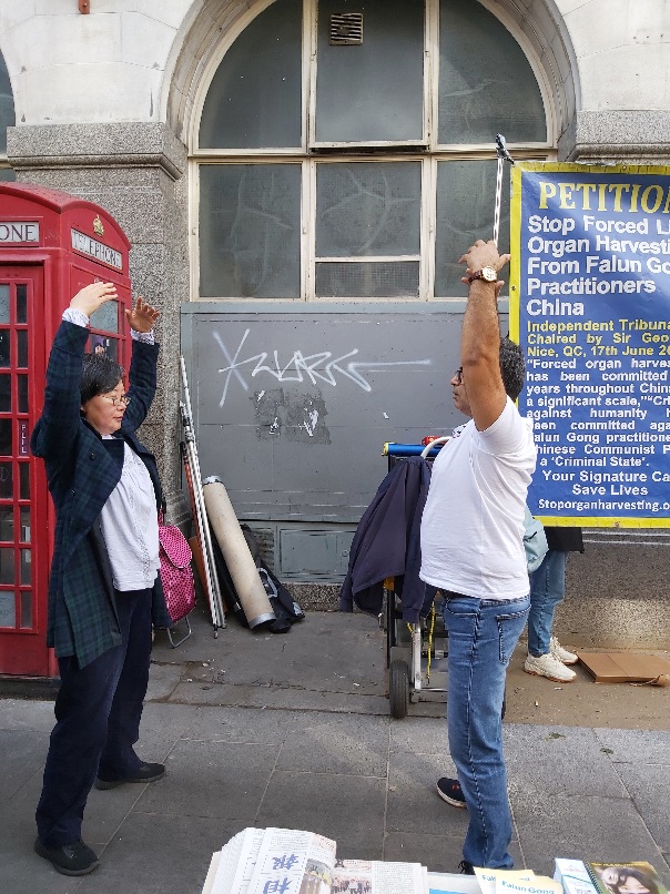 隔日,伦敦唐人街的上法轮功学员的信息点也引起许多路人的注意。