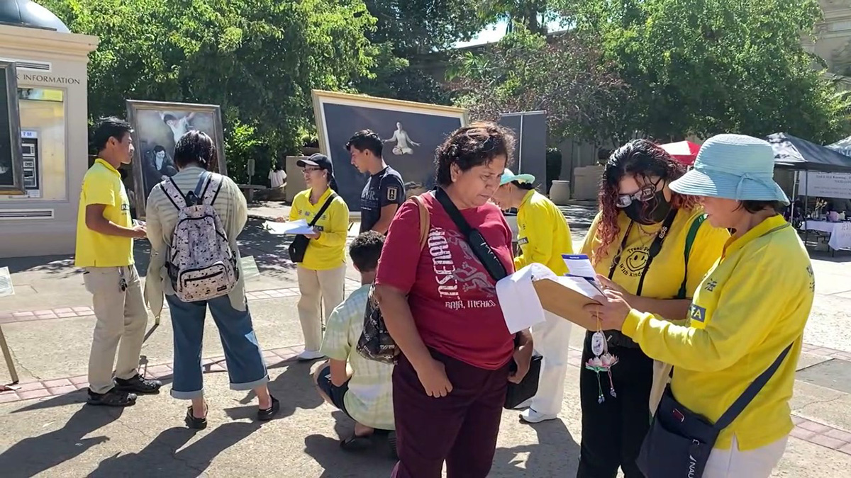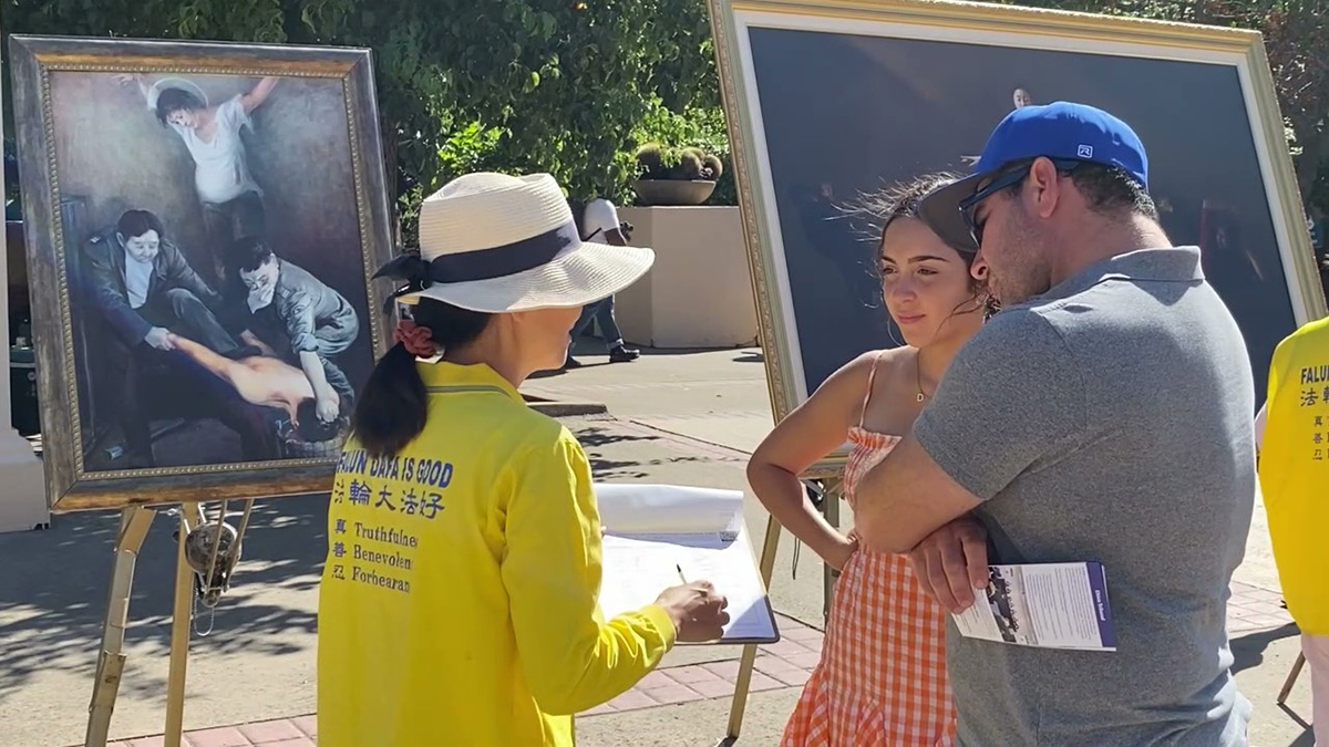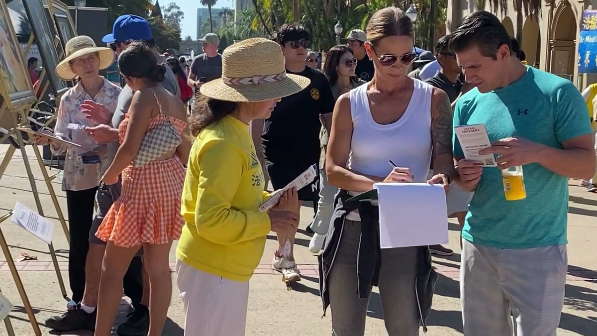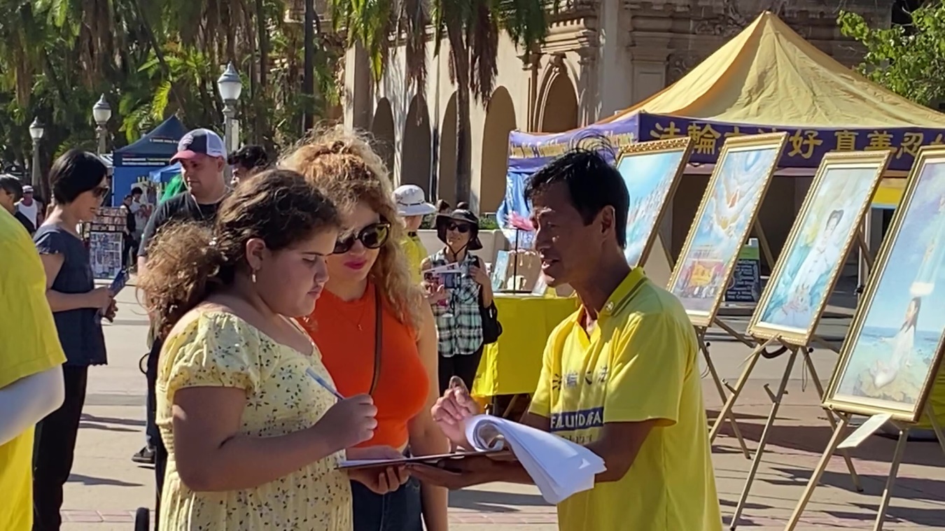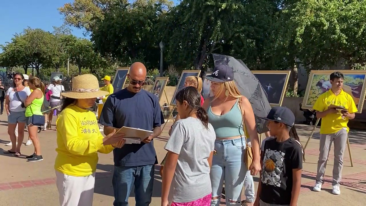 金秋的圣地亚哥,气候宜人,景色迷人,公园内来自世界各地的游人川流不息。当天众多游客驻足观画,凝神良久而动容,感到十分震惊,并纷纷询问、了解为什么中共要迫害法轮功?迫害善良的人们?我们能为你们做些什么?当他们明白真相后,在两次画展中,共有近千名民众签名支持法轮功反迫害。他们当中有来自不同国家和地区的学生、学者, 有不同族裔和肤色的商人,有不同年龄前来观光的游客,也有一家大小前来游玩的当地市民和政府部门工作人员,大家都共同表达了要停止迫害法轮功的愿望与对中共邪恶的愤慨,必须解体它们。