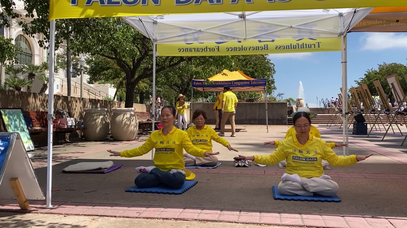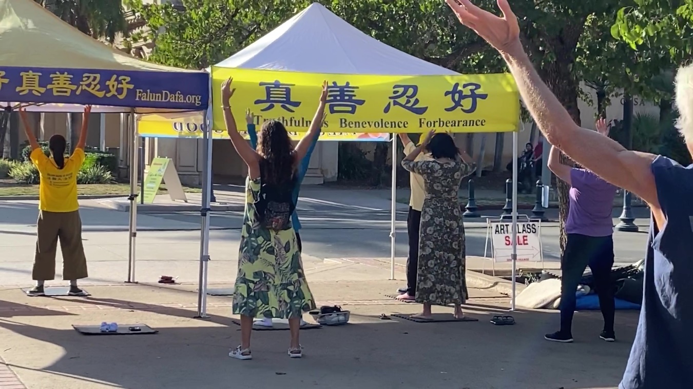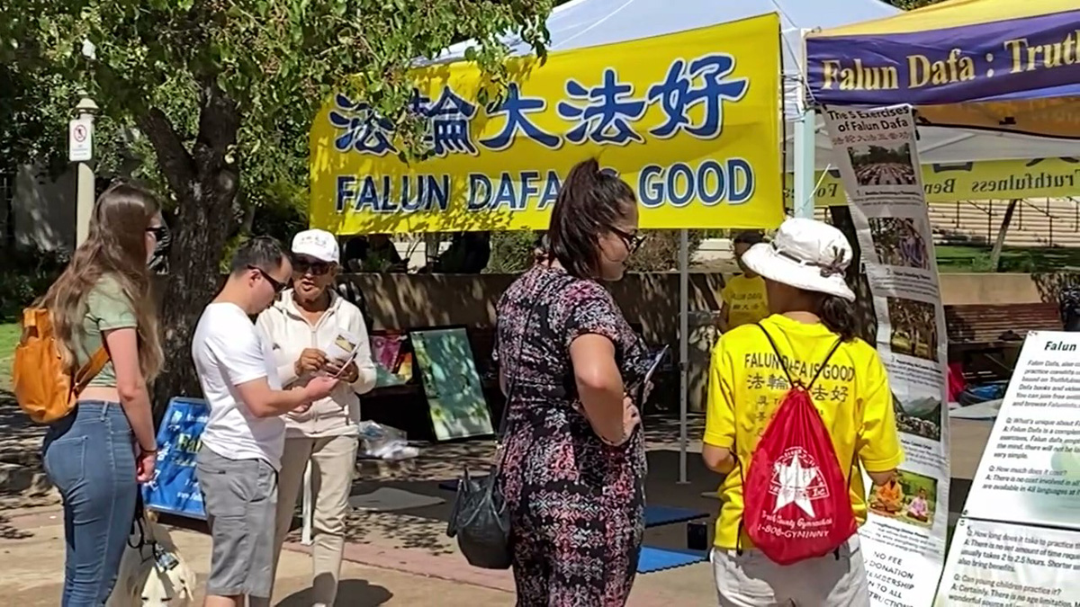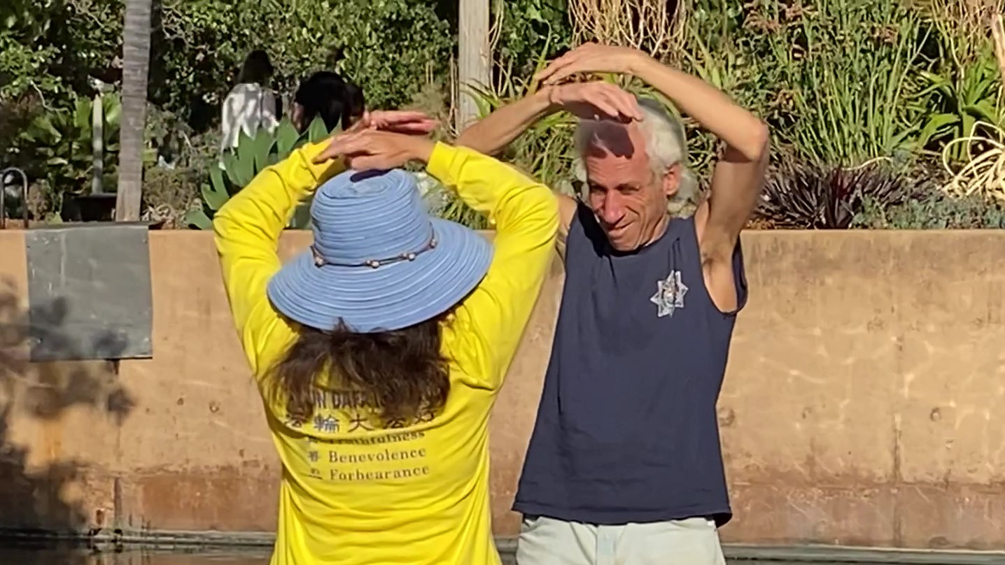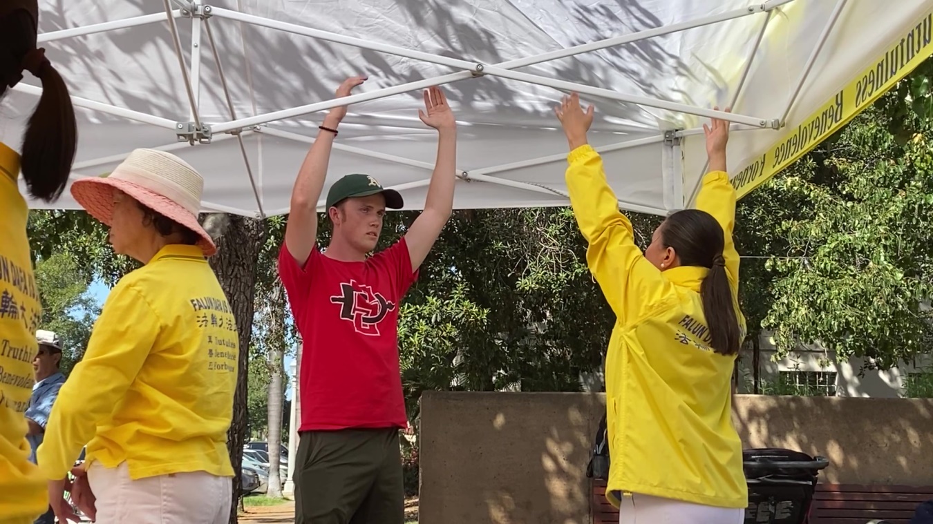 在看到法轮功舒缓、祥和、优美的功法演示后,不少游人在场主动学习法轮功五套功法。有的要了解义务教功地点、时间和联系电话,还有游客立即购买了法轮大法书籍,表示要回去认真学习阅读。