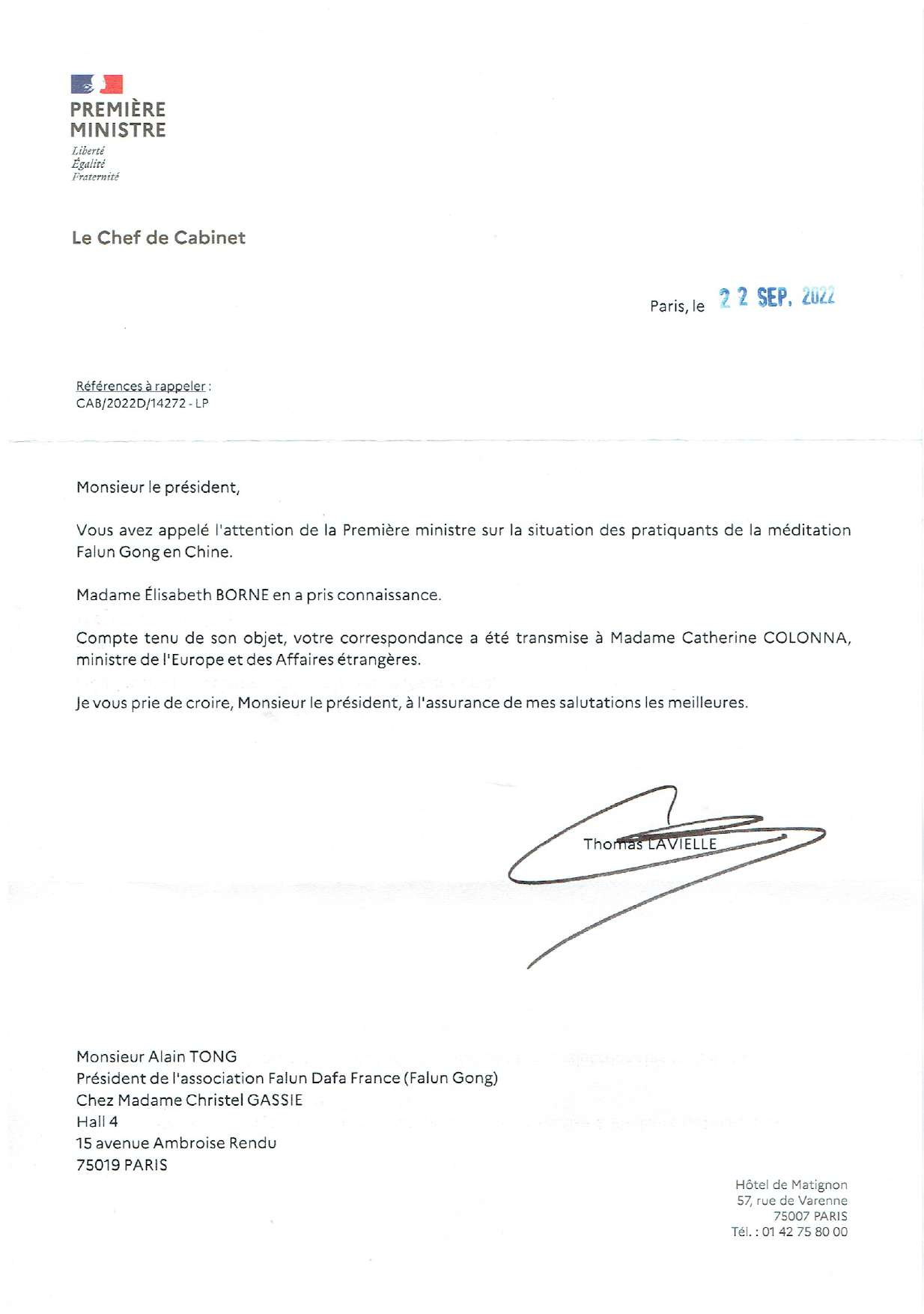 法国新总理伊丽莎白‧博尔纳女士(Elisabeth Borne)办公室在回信中说:“我们已经提请总理关注修炼打坐入静的法轮功修炼者在中国的情况。总理伊丽莎白‧博尔纳(Elisabeth Borne)女士已经关注到了这一点。