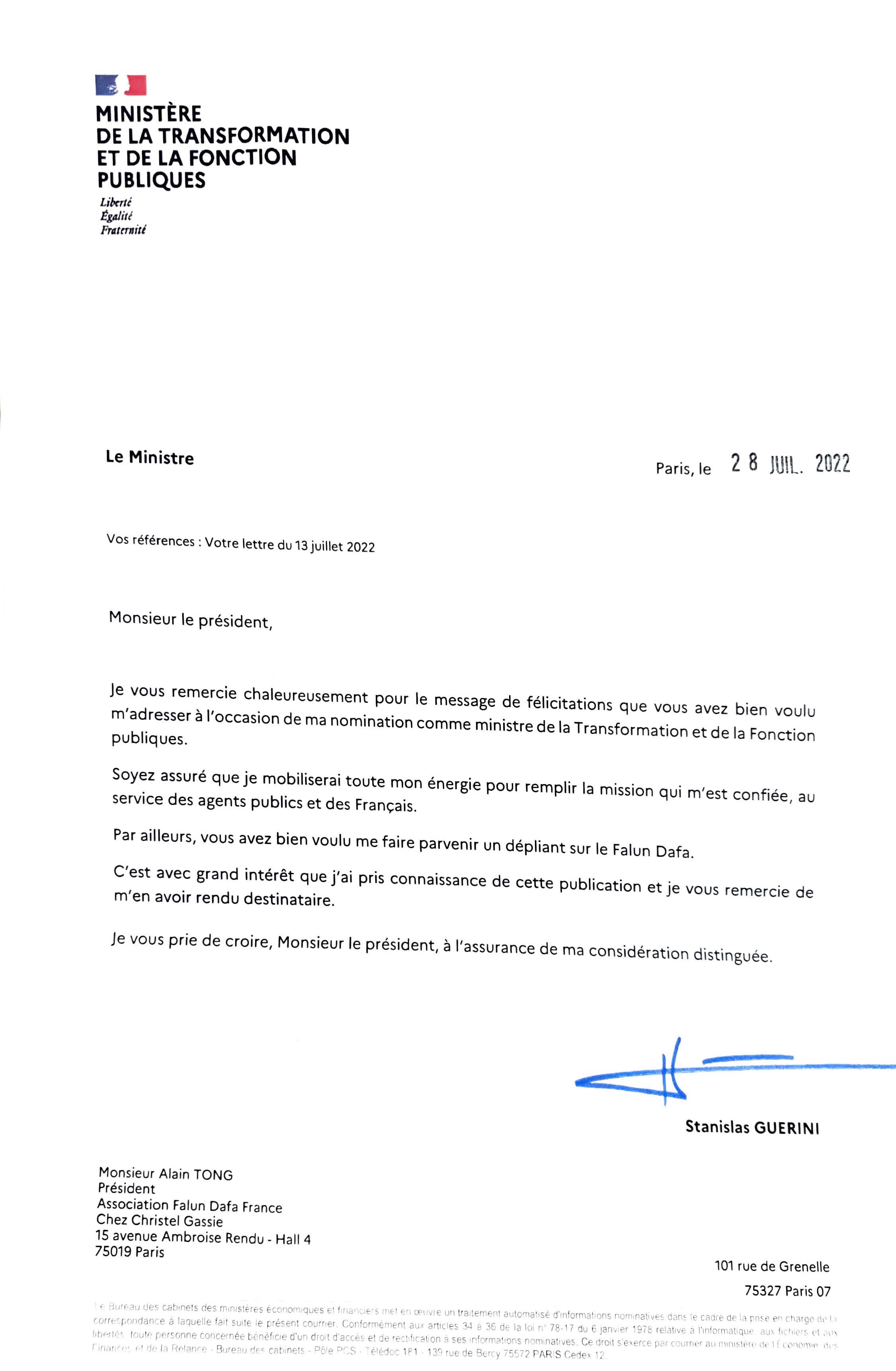 法国“转型与公共事务部”部长斯坦尼斯拉斯‧盖里尼(Stanislas GUERINI)在信中首先表达法轮功学员给他的信。他并说:“请放心,我将全力以赴来完成委托给我的任务和赋予我的使命……此外,我怀着极大的兴趣阅读了(你寄来的)这份资料,并感谢你将其提供给我。”信中最后说:“请接受我最崇高的敬意。”