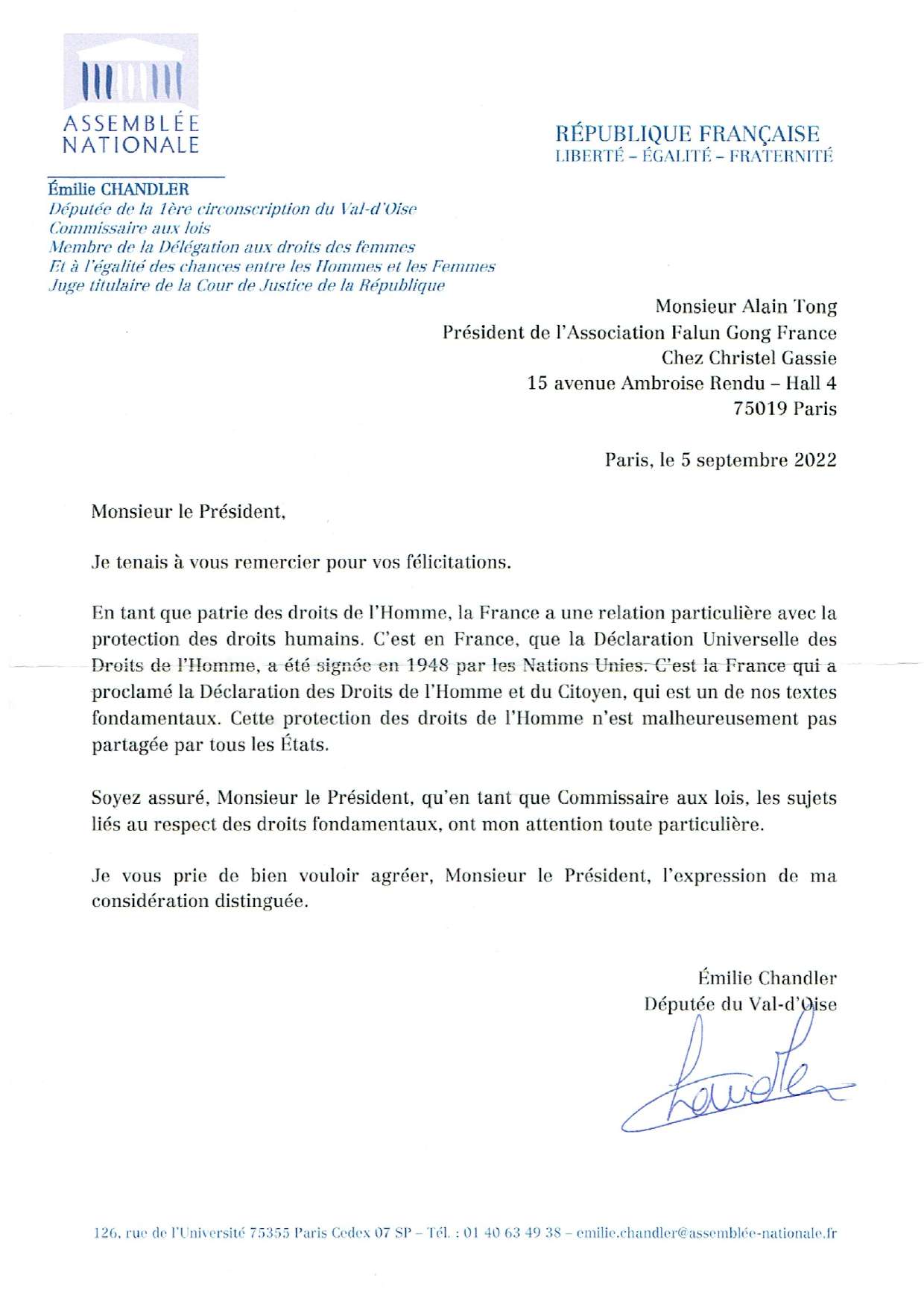 ![]() 图4:法国国会下议院议员埃米莉·钱德勒女士(Émilie Chandler) 在信中,向法轮功学员表达最崇高的敬意。 |