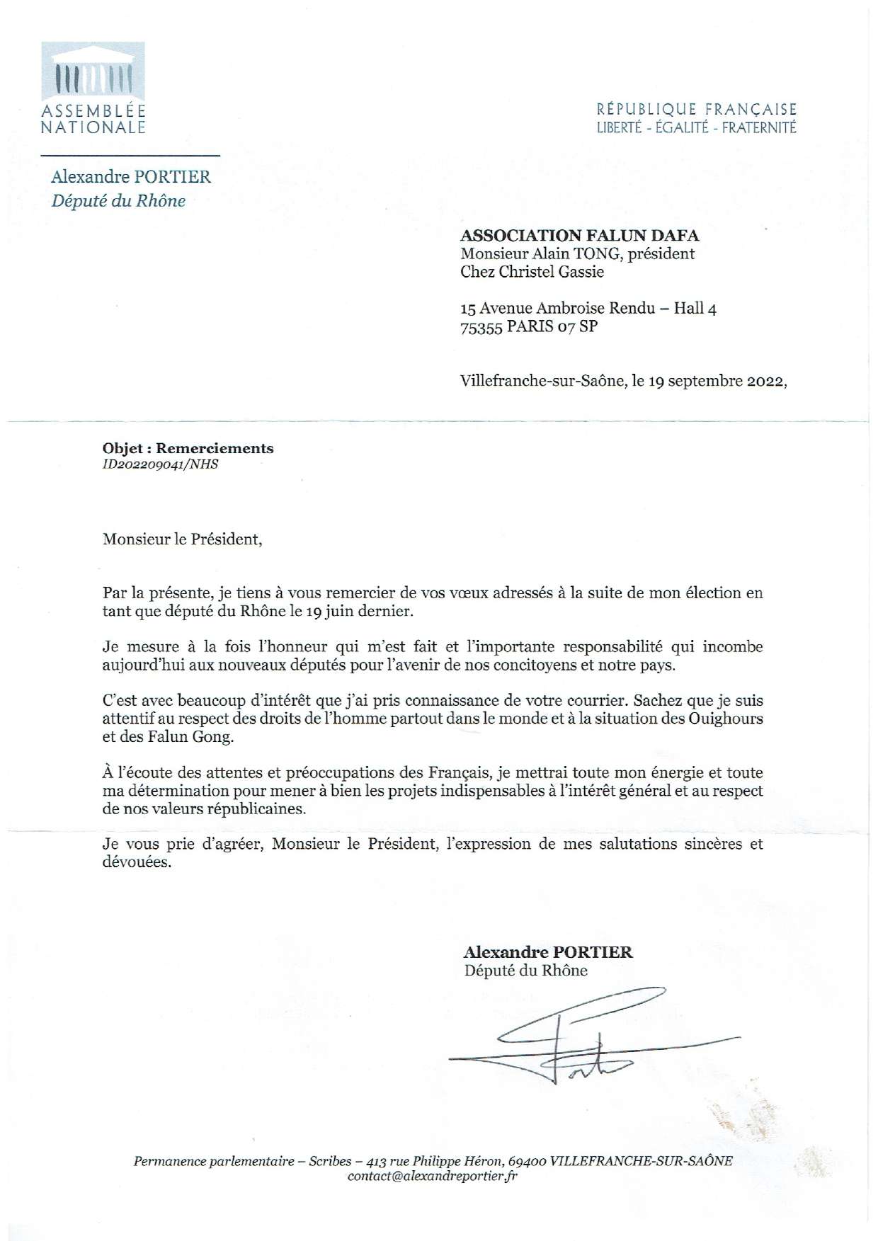法国国会下议院、罗纳河区议员亚历山大‧波蒂尔(Alexandre Portier)在回信中说:“我怀着极其专注的心态阅读了你的信。我想让你知道,我很关注世界人权状况及维吾尔族和法轮功的情况。”