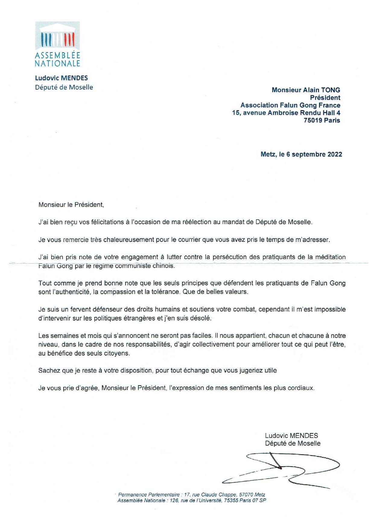 法国国会下议院、摩泽尔区议员卢多维克‧门德斯先生(Ludovic MENDES),在信中说:“我注意到你们一直在与中共政权打压和迫害法轮功修炼者的行径抗争。法轮功学员所坚持的唯一原则是真、善、忍。这是一个多么美好的价值观。我是一个热衷于人权的捍卫者,我支持你们的抗争……”