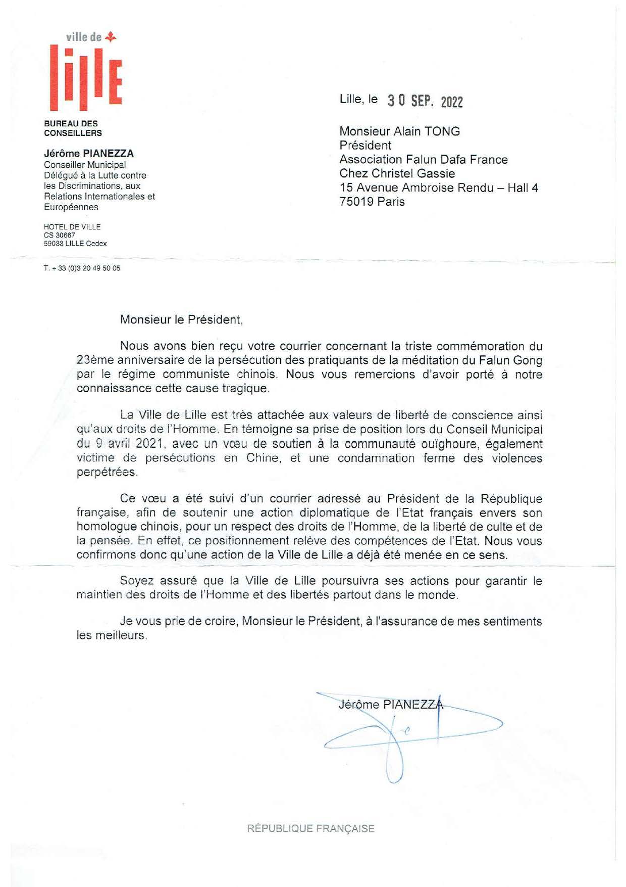 里尔市市议员,反歧视和国际及欧洲关系代表杰罗姆·皮亚内扎(Jérôme PIANEZZA)先生在来信中谈到:“感谢你们提请我们关注、法轮功修炼者遭受中共当局迫害二十三年、这一悲惨事实。里尔市非常重视理性的自由和人权的价值。因此,我们已向法兰西共和国总统发出一封信,表示我们支持法国在对中国的外交行动中,争取尊重人权、文化和信仰自由的权利。”