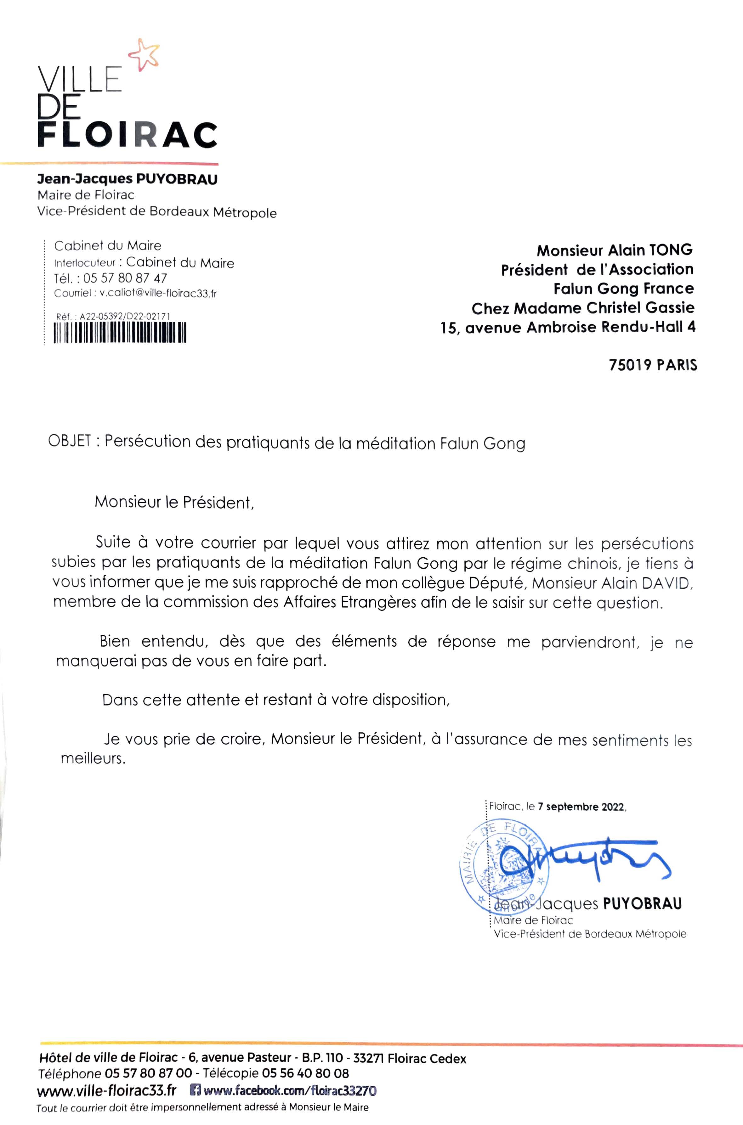 波尔多大都会副主席让-雅克‧皮约布劳先生(Jean-Jacques PUYOBRAU)表示:“我已经与我的同事们说了这件事。我还向我的同僚议员、外交事务委员会的成员之一的阿兰‧大卫(Alain David)先生谈了这个问题。一旦我收到答复,我一定会通知你。”信中最后说:“请接受我最崇高的敬意!最好的问候!”