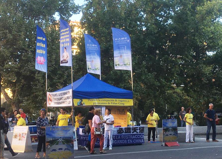 午后阳光明媚,清风微拂,部份法轮功学员在费尔南多天主国王像(Monumento al Rey Fernando el Católico)附近展示法轮功功法。许多人被优美的动作和舒缓的音乐所吸引,并驻足观看。有的行人前来主动了解法轮功,并就地跟学员学炼法轮功的功法动作。