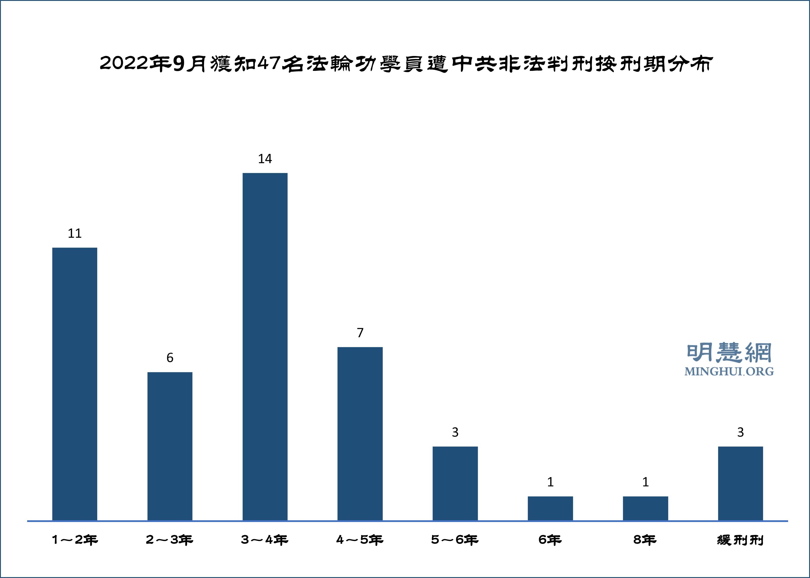 ![]() 图2:2022年9月获知47名法轮功学员遭中共非法判刑按刑期分布 |