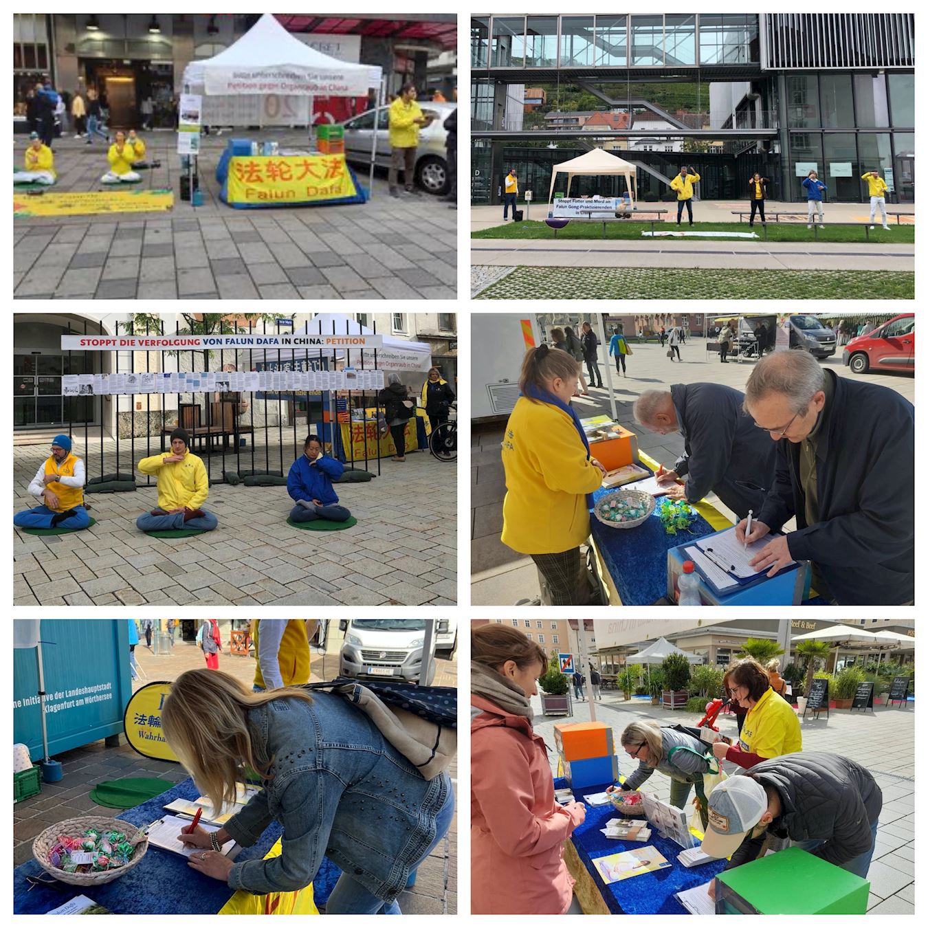 在萨尔斯堡州的萨尔斯堡市和哈林市,许多人一看到揭露中共活摘法轮功学员器官罪行的横幅,就过来签名要求制止活摘罪行。一位女士被深深地感动了,还叫来朋友一起签名。