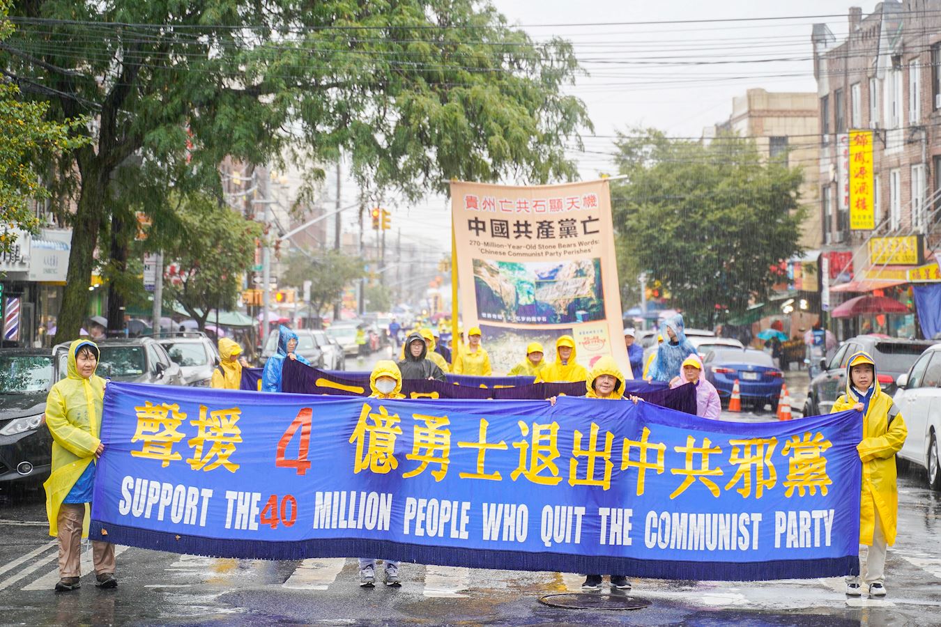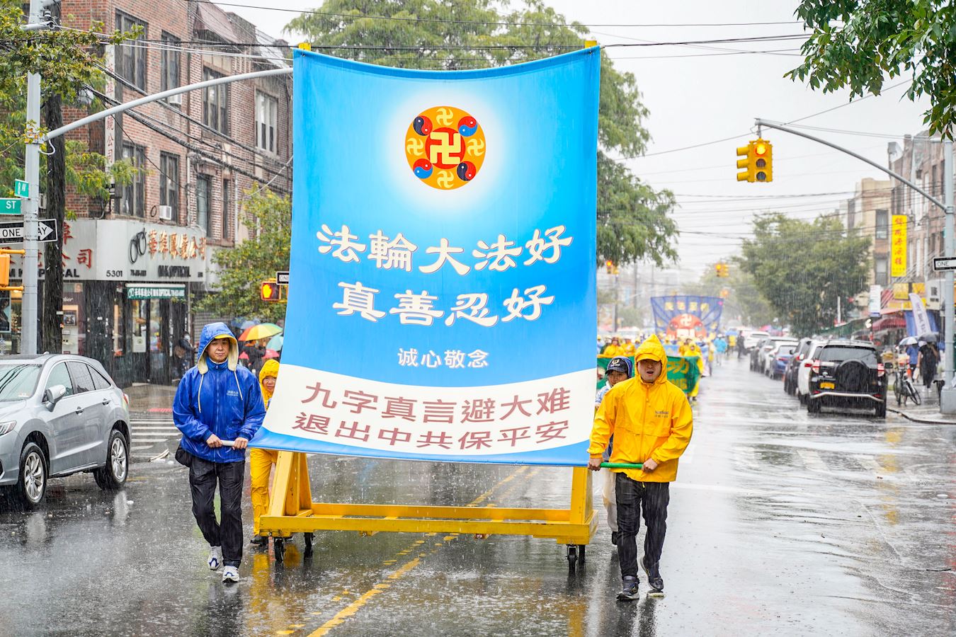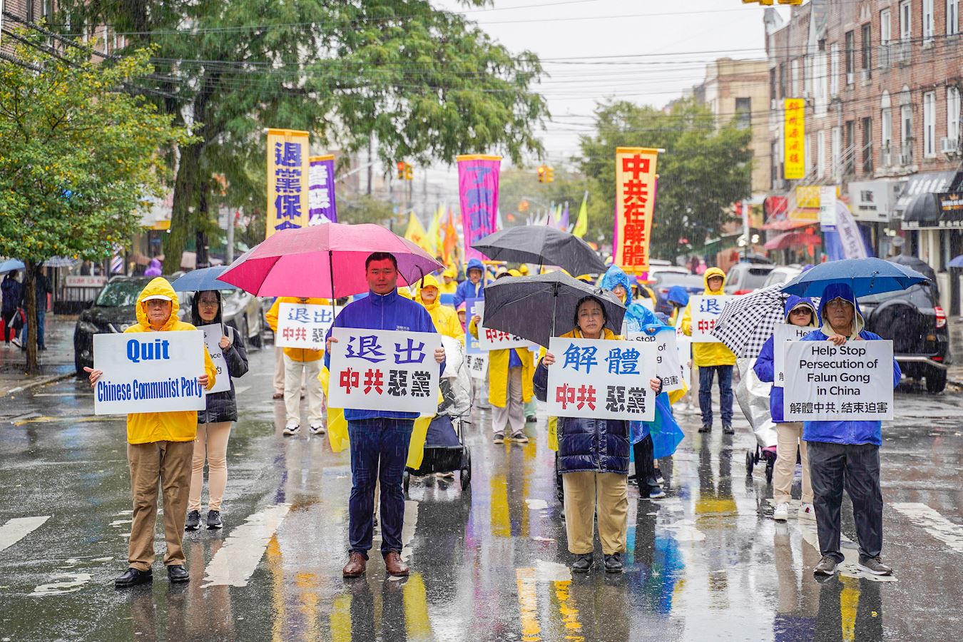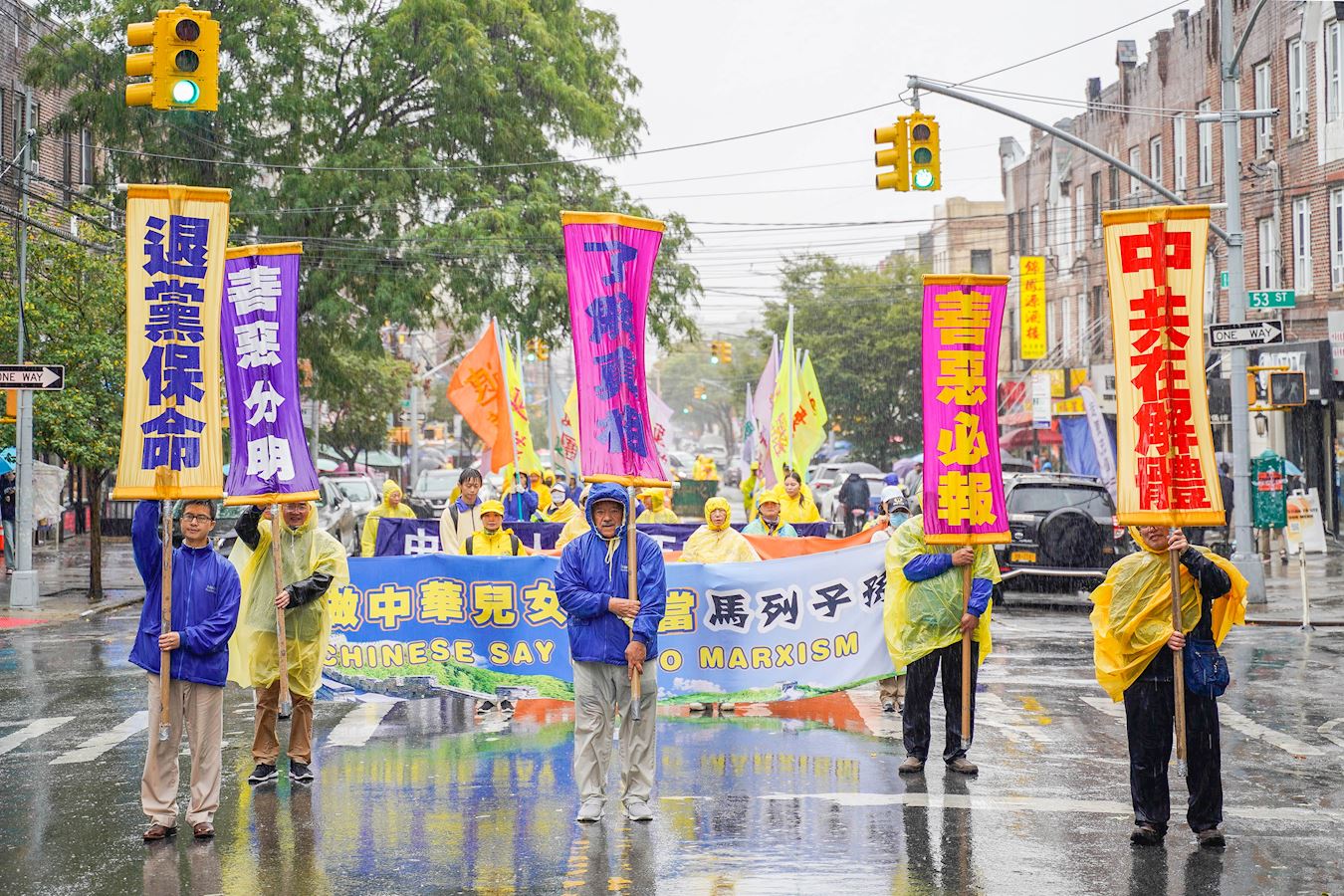 【明慧网二零二二年十月五日】二零二二年十月二日中午,纽约布碌仑八大道华人街上旌旗招展,锣鼓喧天,法轮功学员在风雨中如期举行盛大游行,传递真相,声援四亿中国人退出中共党团队。风雨中,上千名法轮功学员一如既往的浩大场面,令人震撼。