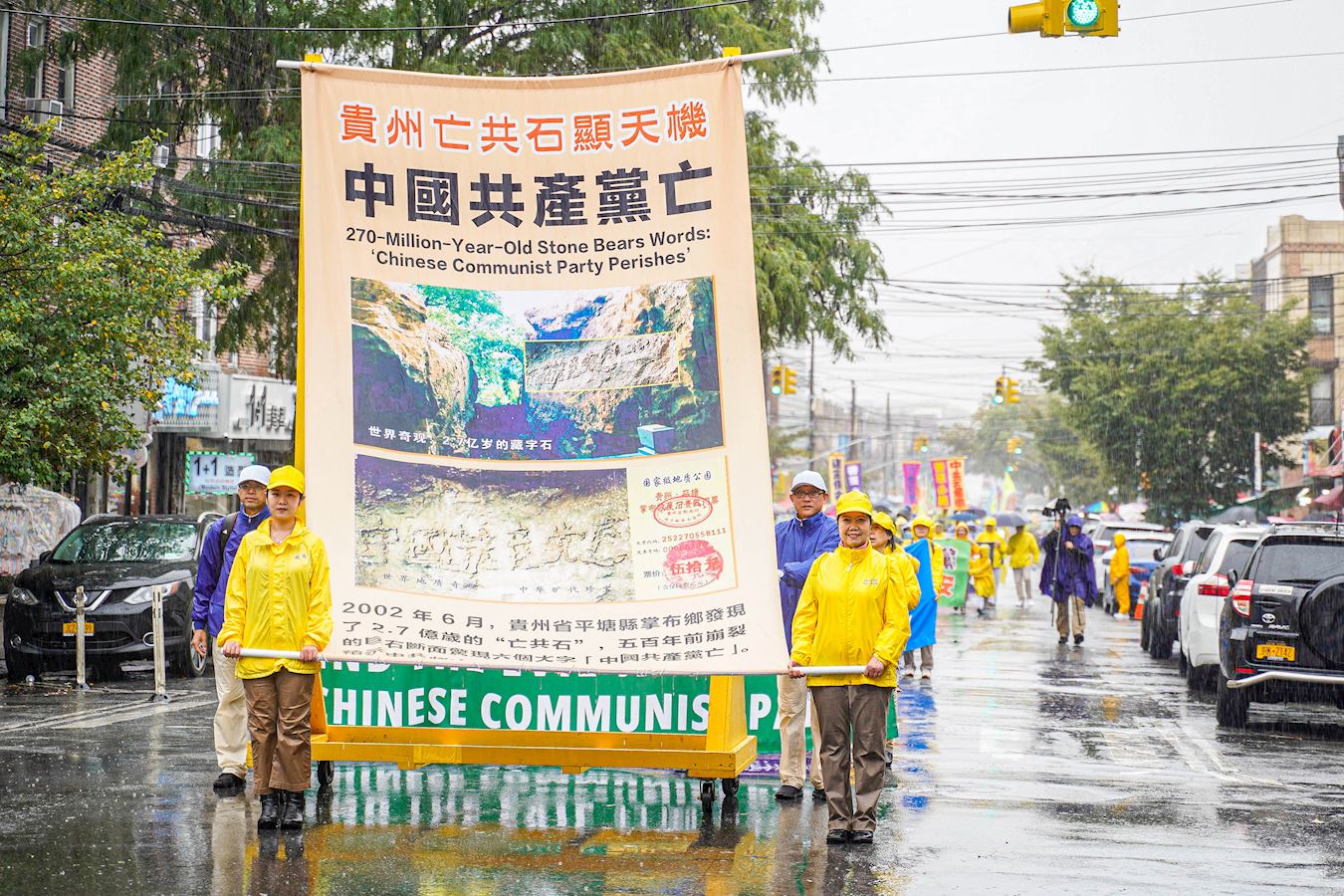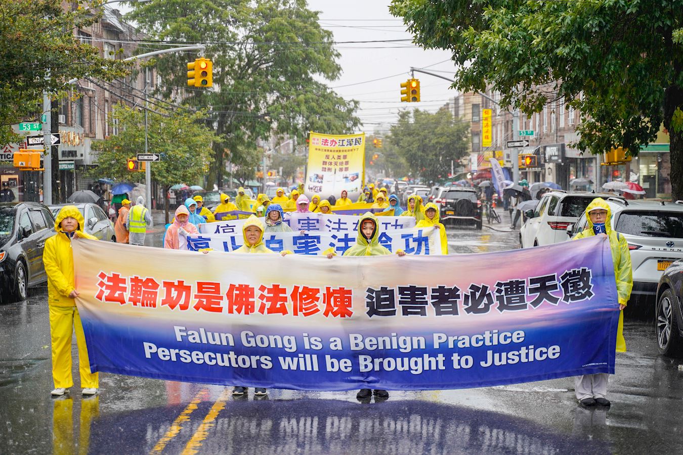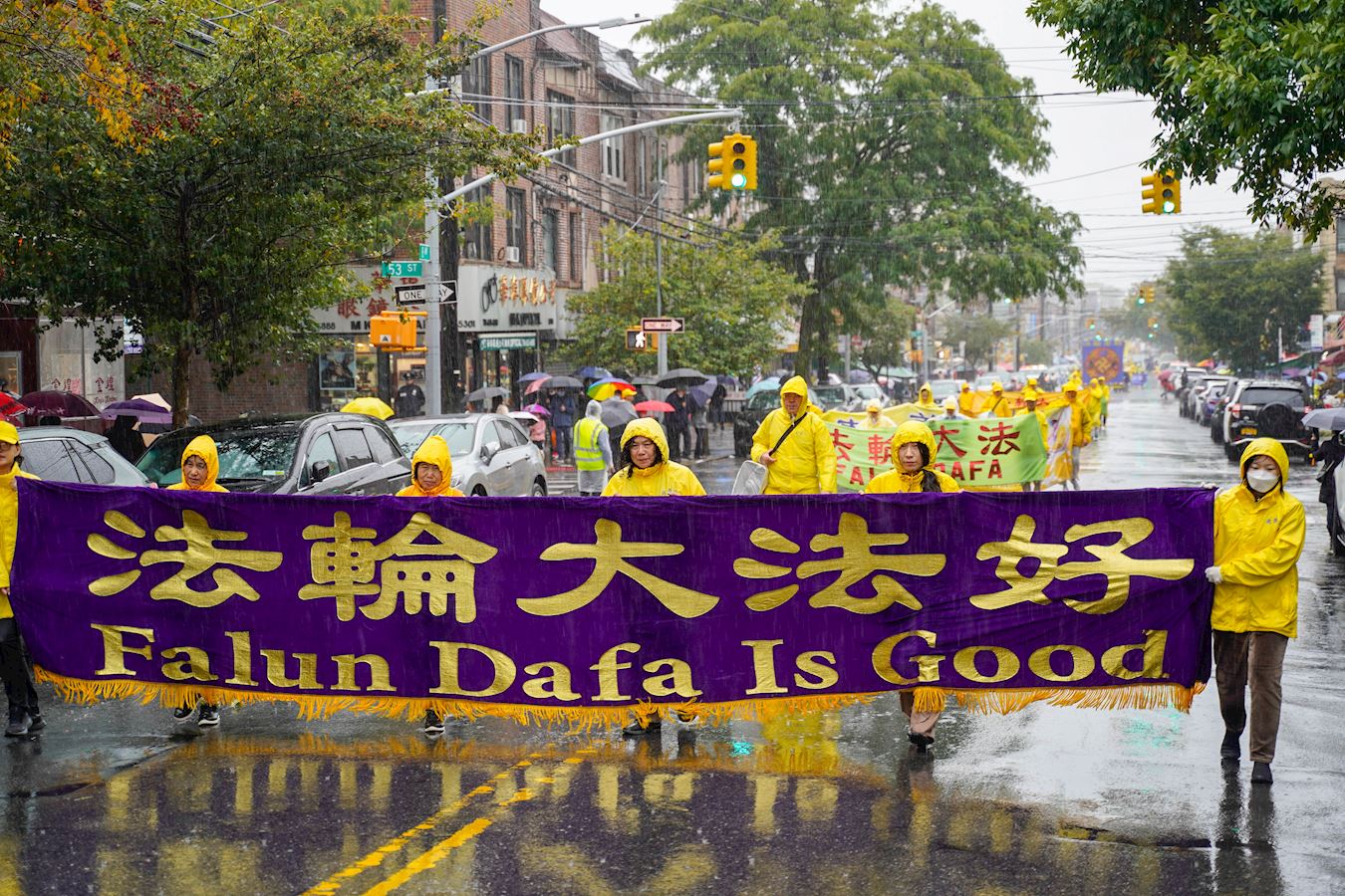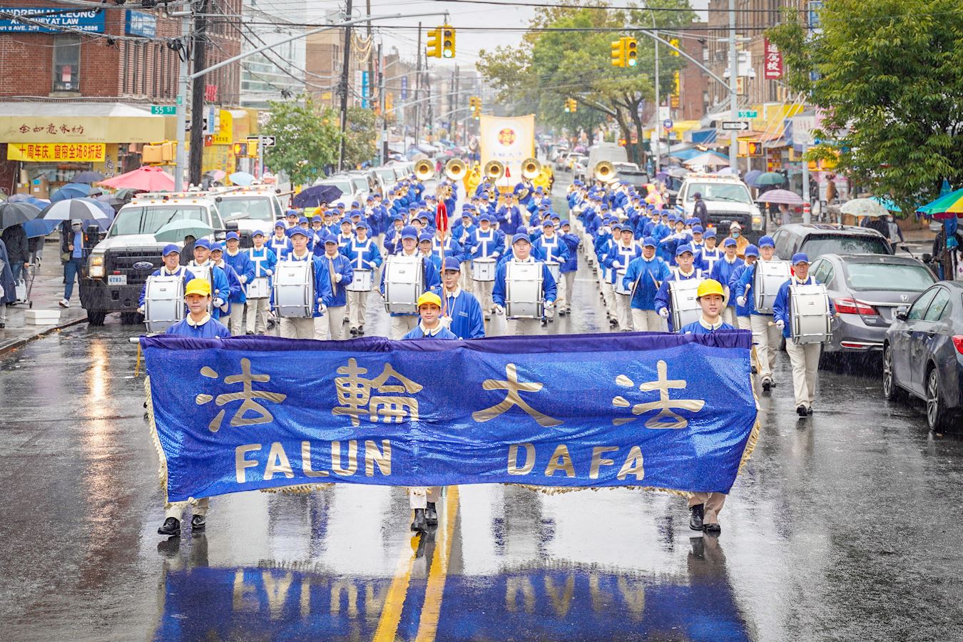 【明慧网二零二二年十月五日】二零二二年十月二日中午,纽约布碌仑八大道华人街上旌旗招展,锣鼓喧天,法轮功学员在风雨中如期举行盛大游行,传递真相,声援四亿中国人退出中共党团队。风雨中,上千名法轮功学员一如既往的浩大场面,令人震撼。