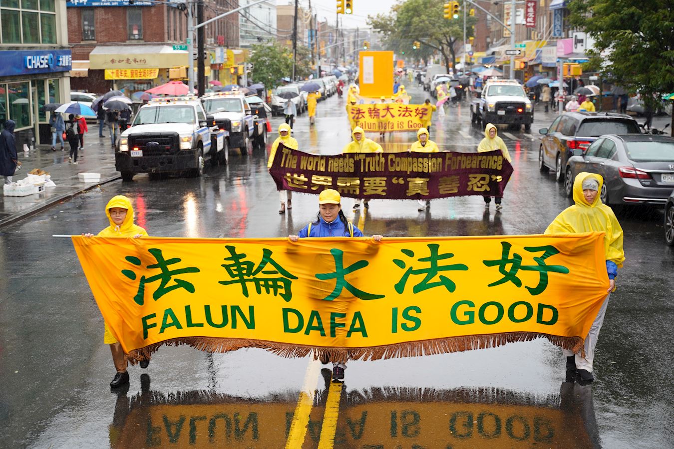 访民葛丽芳专门从法拉盛赶来观看游行,对于法轮功学员冒着风雨举行游行,她感动地说:“法轮功学员二十多年如一日地坚持,一年三百六十五日每天坚持,特别是法拉盛的真相点,没有一天落下的,无论严寒酷暑。我的理解是:法轮功学员真的是在救人。天气不好,法轮功学员还有这么多人出来,就是为了挽救被蒙蔽的中国人。”